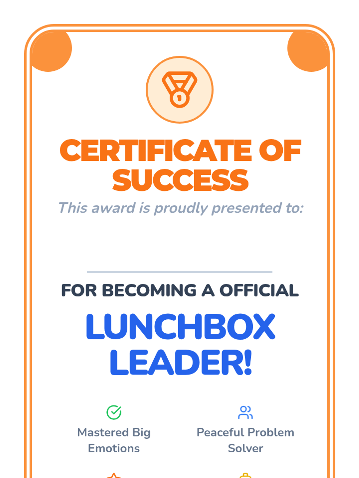 A celebratory graduation certificate for students who complete the Lunchbox Leaders program, recognizing their growth in social skills and organization.