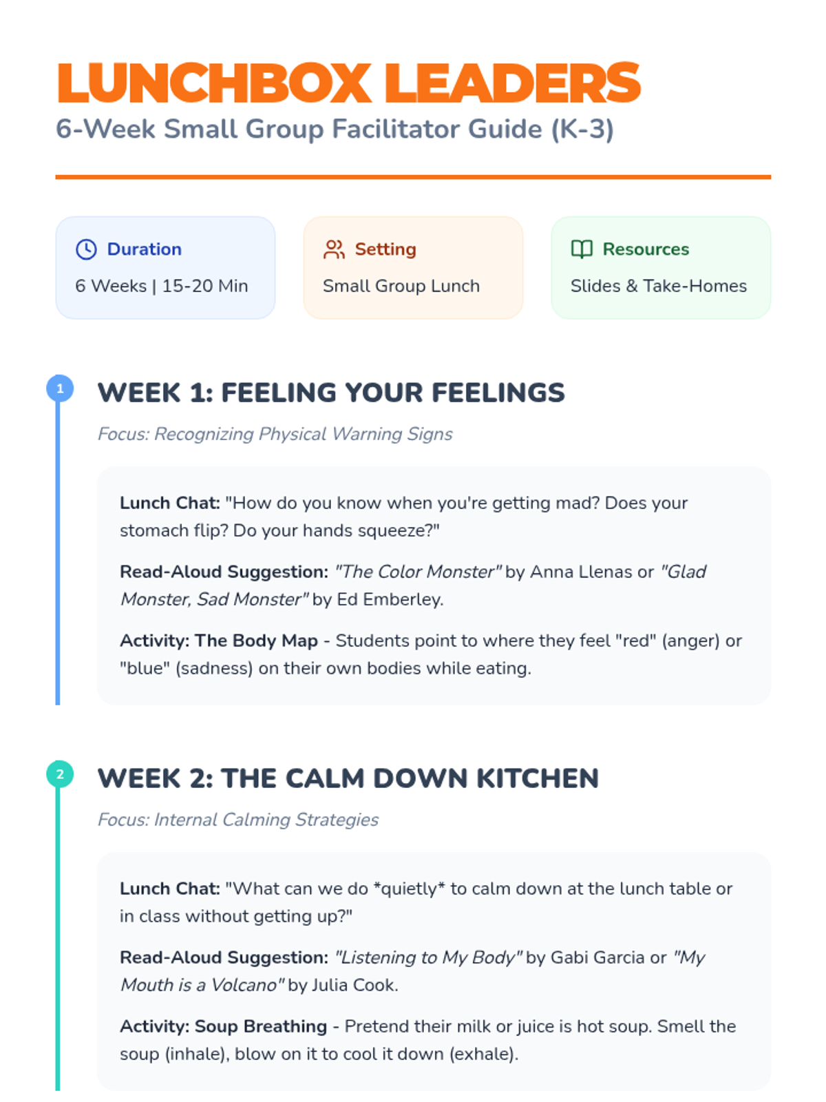 An updated facilitator guide for the Lunchbox Leaders program, including specific book recommendations for each week and clear activity instructions.