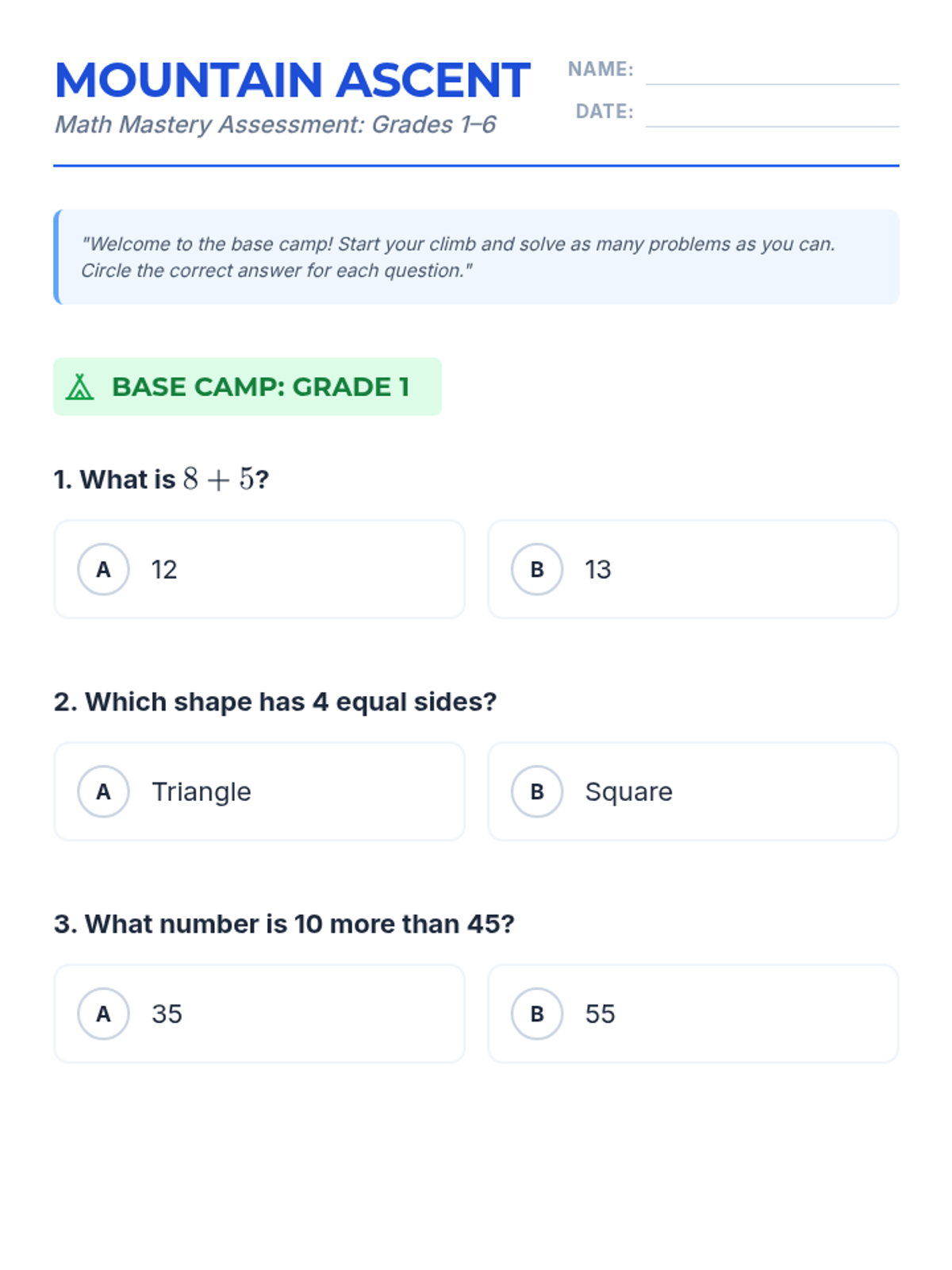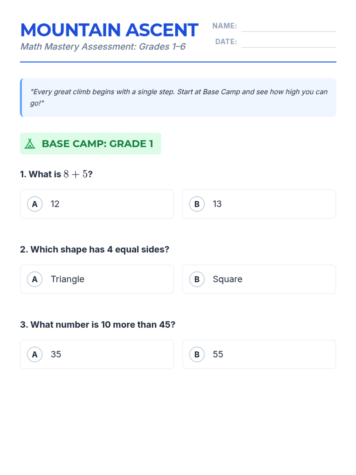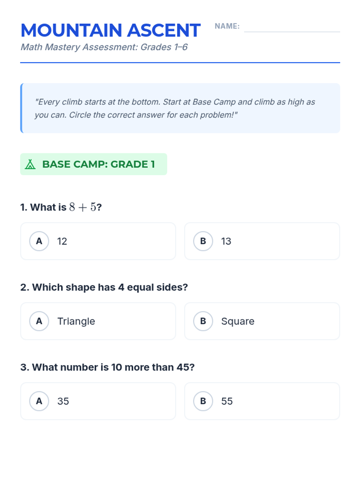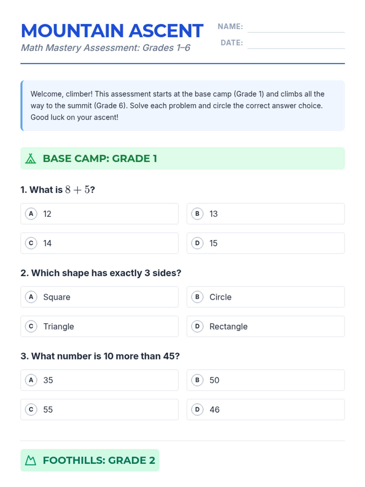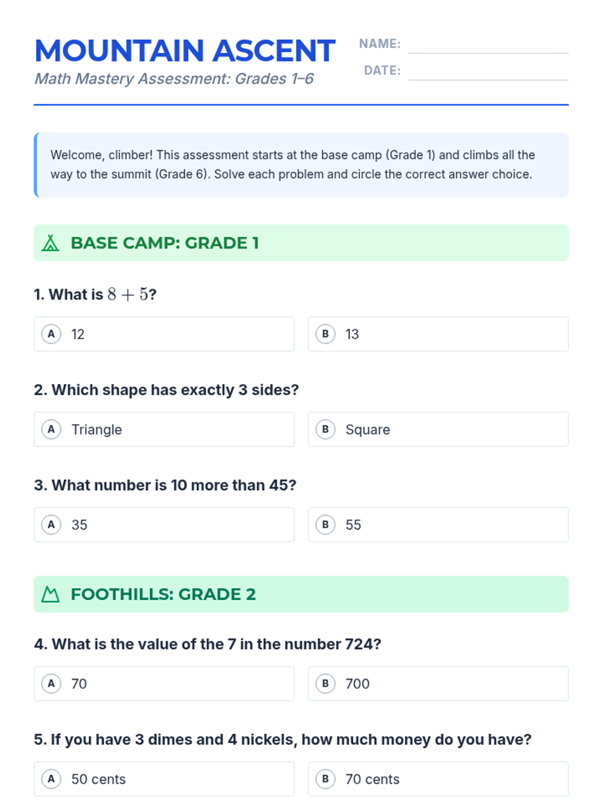 A math assessment document featuring 17 multiple-choice questions ranging from Grade 1 to Grade 6, themed around a mountain climbing journey.