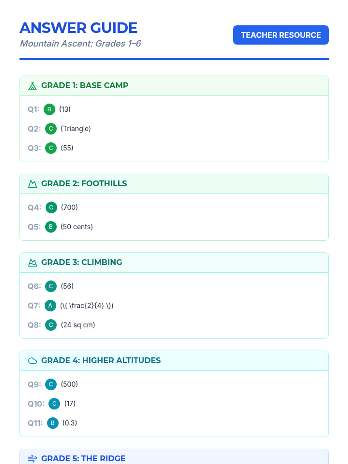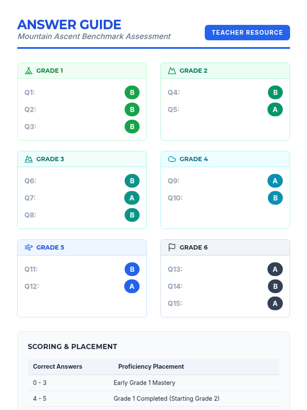 A comprehensive answer key and teacher guide for the Math Mountaineer Diagnostic, including detailed solutions, scoring ranges, and a domain mastery guide. Improved alignment and formatting.
