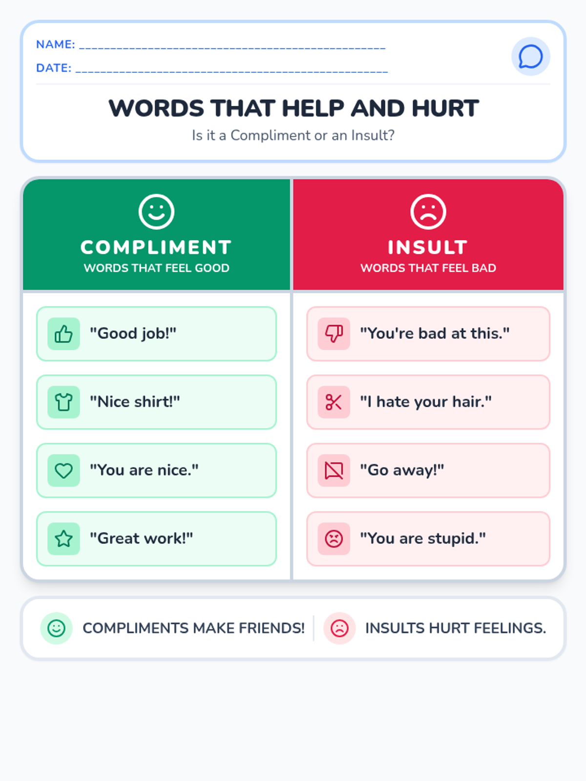 A set of sorting cards for hands-on practice. Students cut out phrases and sort them into compliments or insults to reinforce social understanding.