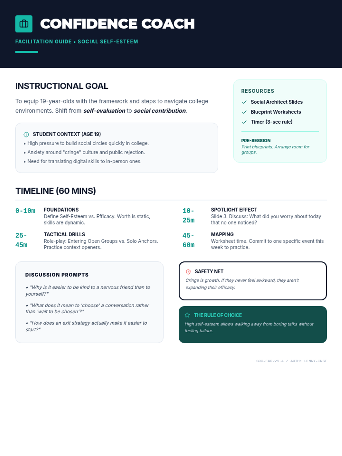 A teacher's facilitation guide for leading a workshop on self-esteem and social skills for young adults. Includes lesson pacing, role-play activity ideas, and discussion prompts for college-aged students.