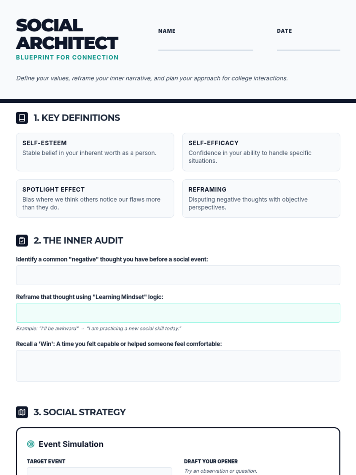 A worksheet for young adults to build self-esteem and social strategies. It includes sections for definitions, cognitive reframing of social anxiety, and a planning template for approaching people at college events.