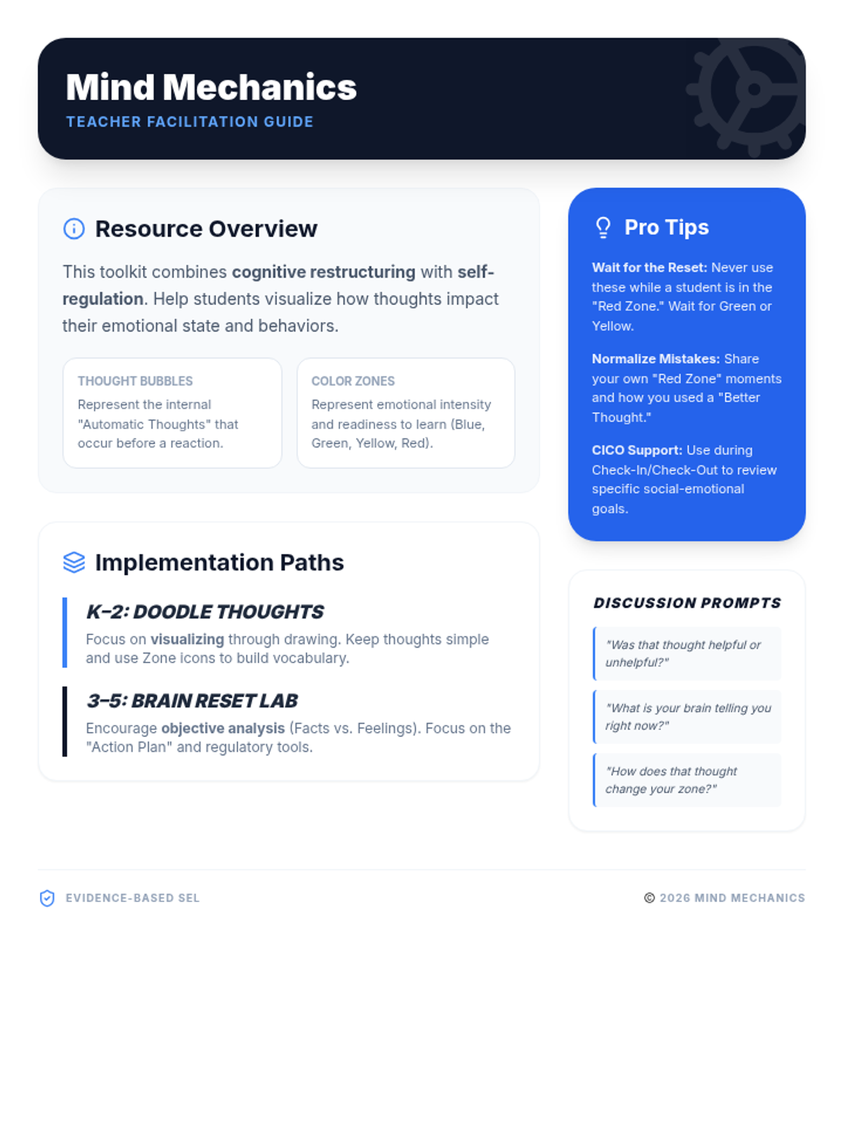 A teacher resource providing an overview of cognitive restructuring, implementation strategies for different grade levels, and practical tips for using the Mind Mechanics worksheets. Revised for one-page layout and better spacing.