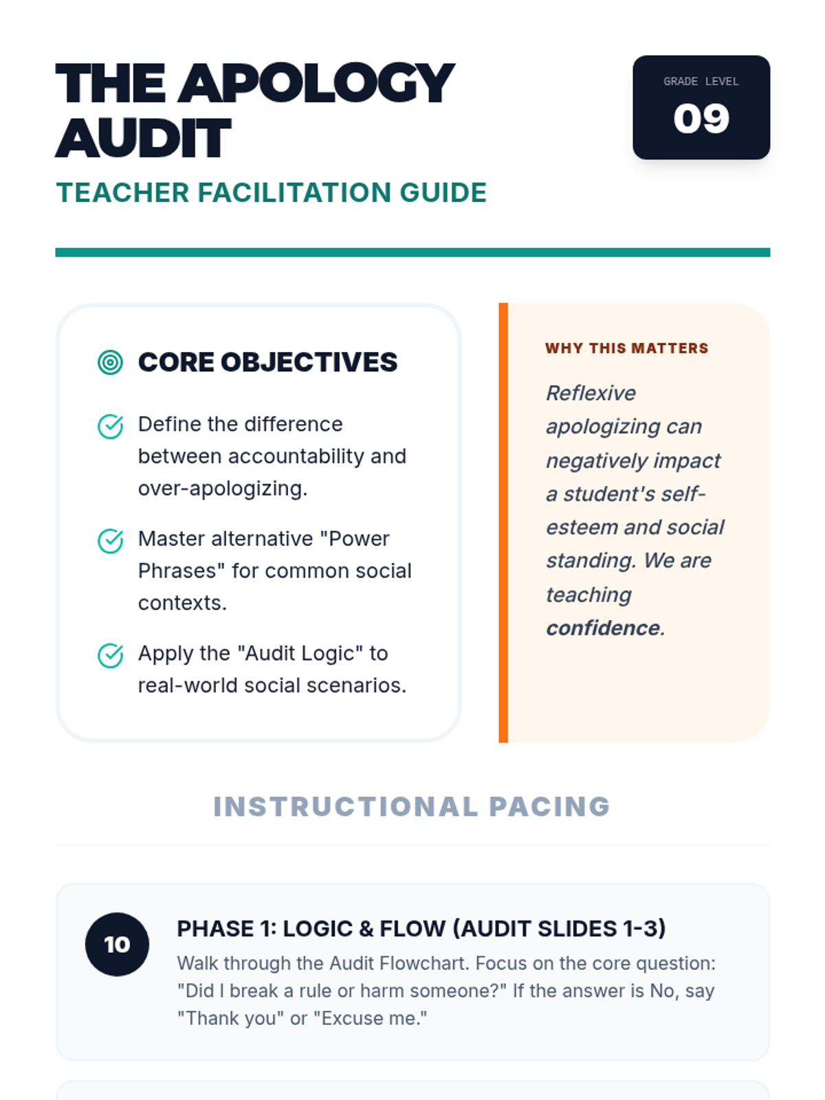 A comprehensive facilitator guide for teachers, providing pedagogical context on over-apologizing in autism, delivery instructions, and troubleshooting tips.