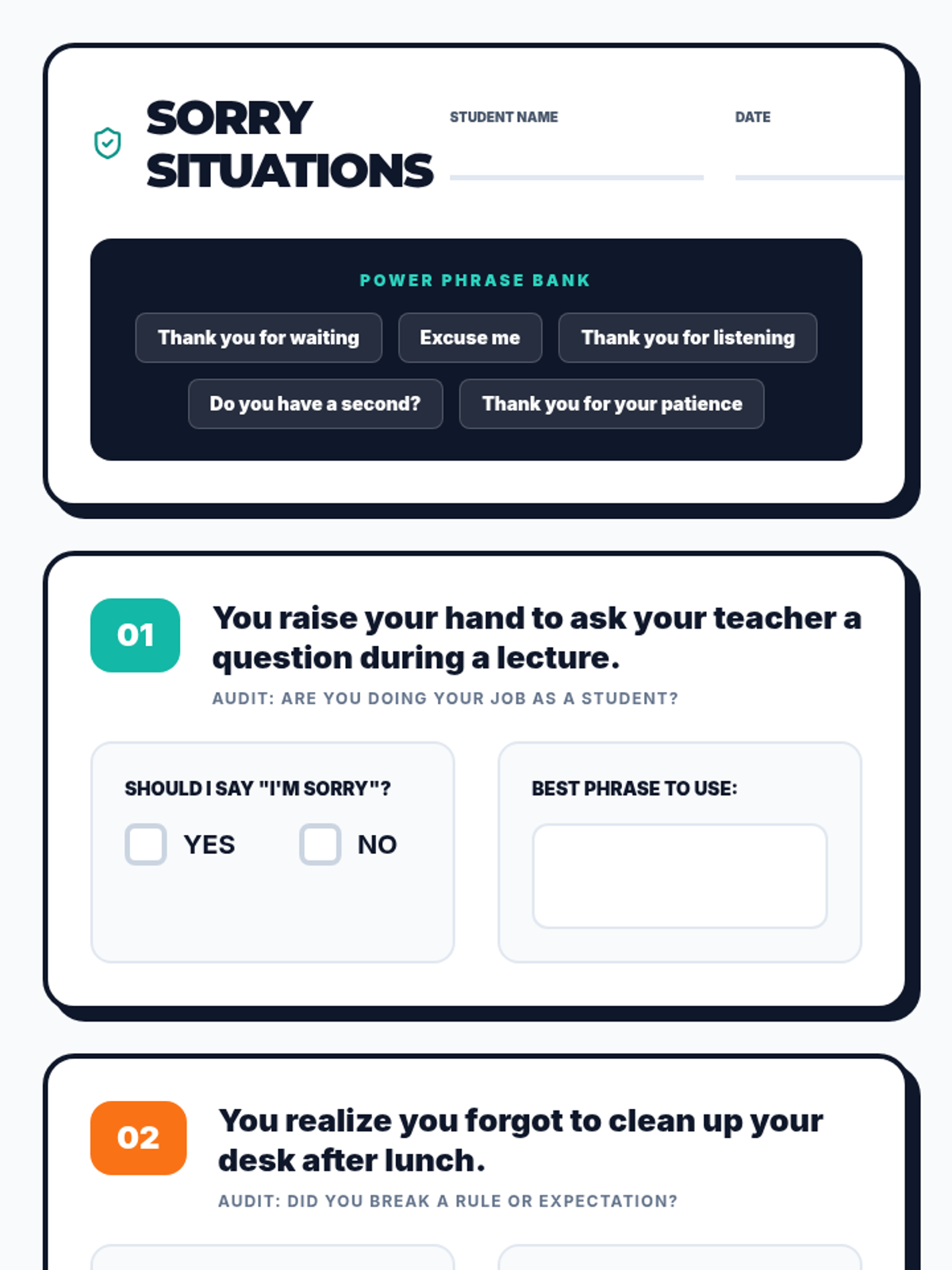 A practice worksheet where students audit various social situations to decide if an apology is necessary and practice replacing it with appropriate "power phrases."