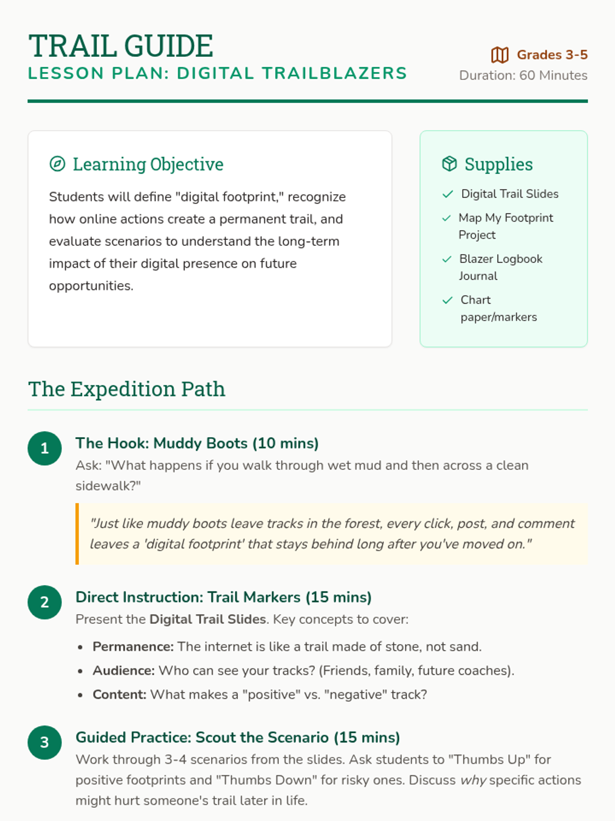 A comprehensive teacher's guide for the Digital Trailblazers lesson, featuring a wilderness-themed instructional path, learning objectives, and delivery tips for grades 3-5.