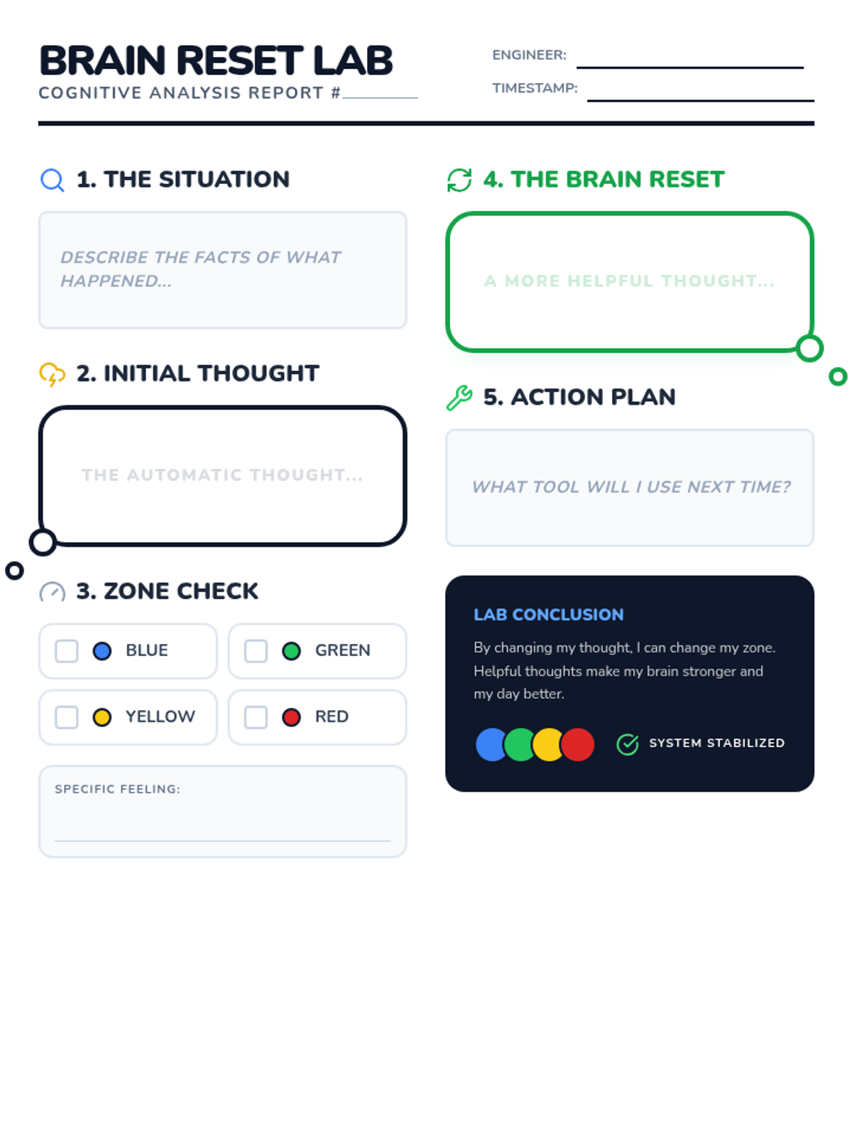 A more advanced cognitive restructuring worksheet for grades 3-5, styled as a 'Lab Report' to encourage objective analysis of triggers, automatic thoughts, and helpful replacement thoughts. Revised for better readability and spacing.