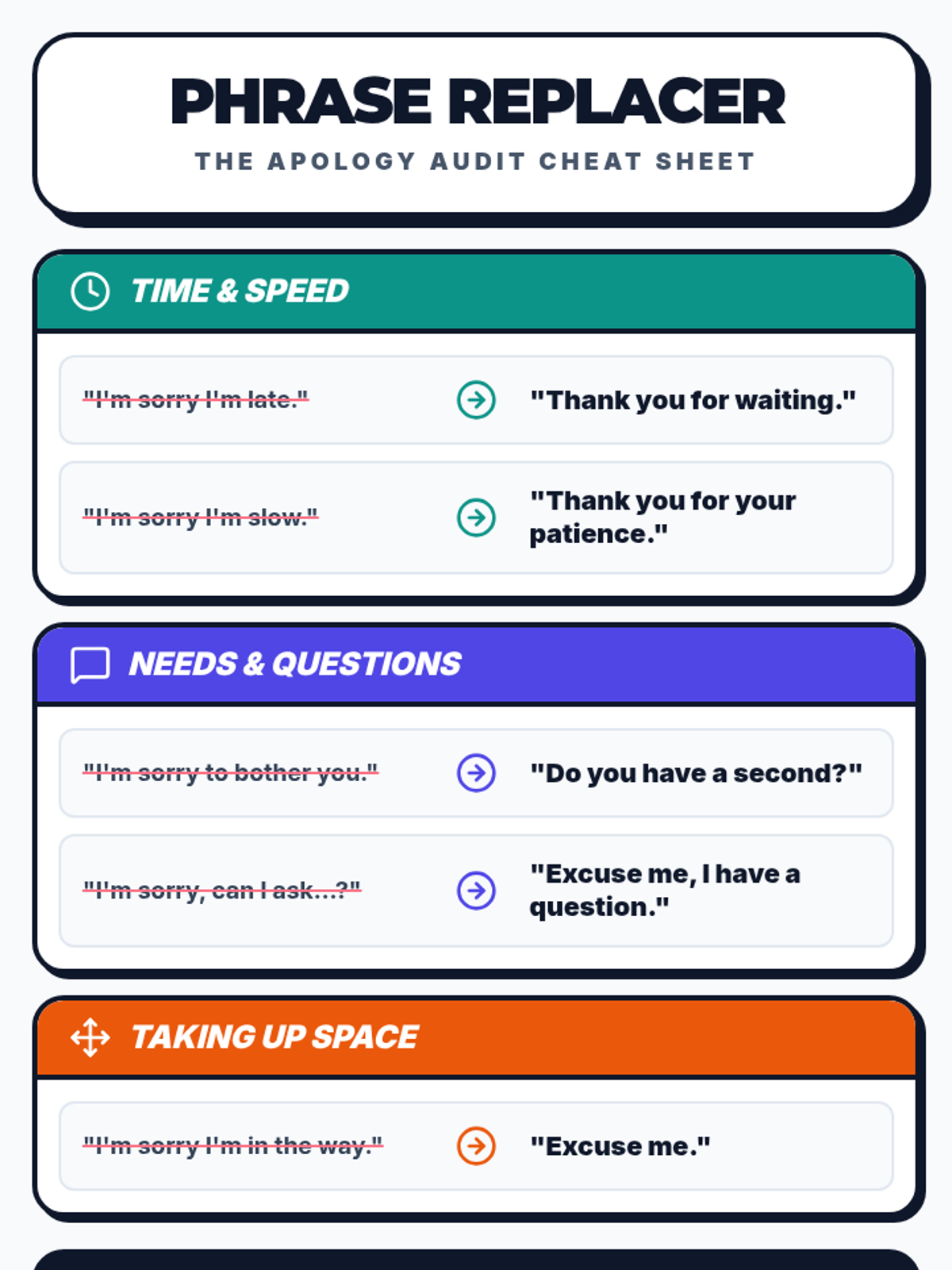 A one-page visual reference guide listing common over-apologies and their more effective replacements, designed for quick desk-side or binder use.