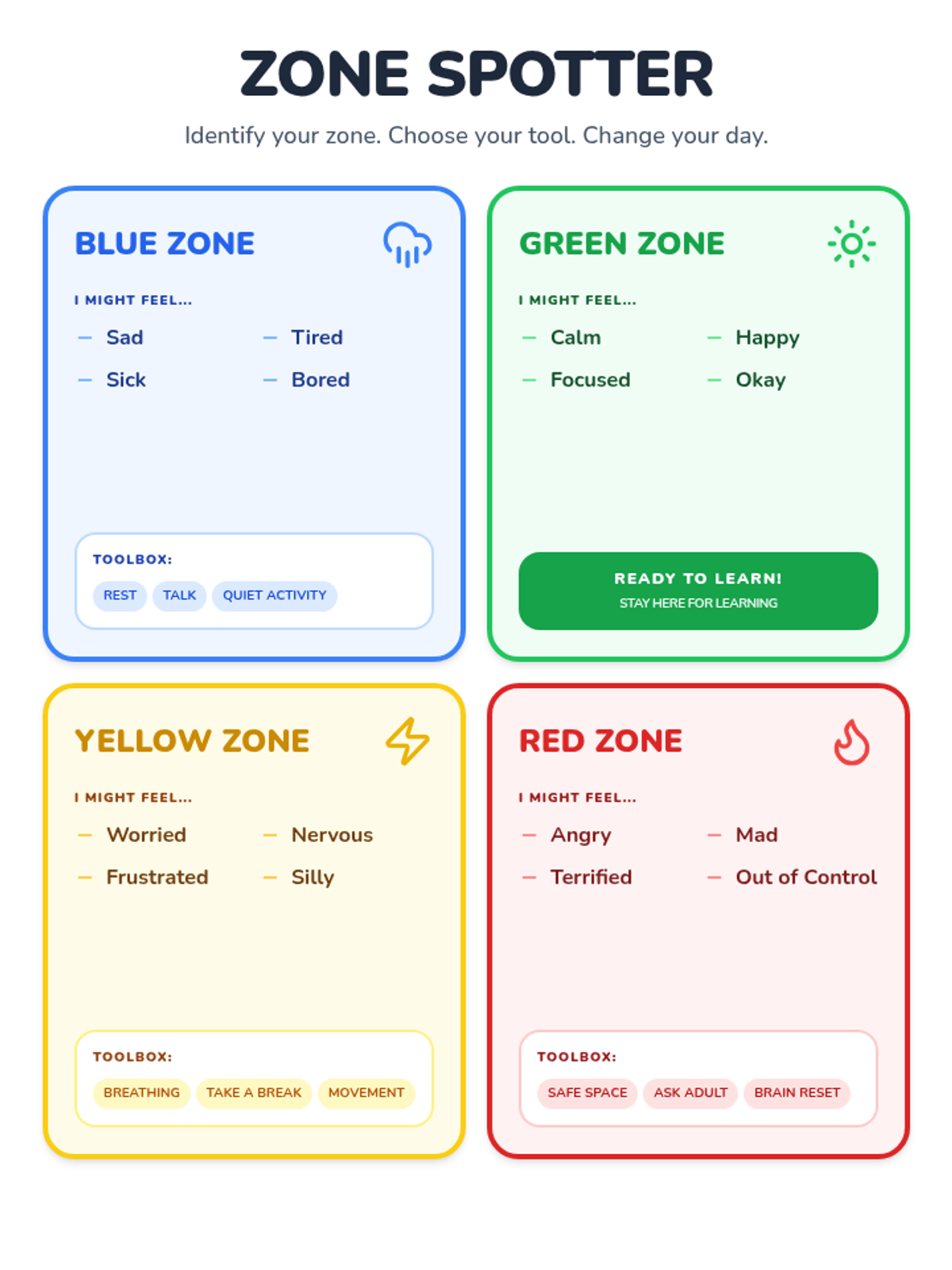 A clear, color-coded reference sheet for identifying emotions across the four zones (Blue, Green, Yellow, Red) and suggested tools for regulation. Revised for better contrast and one-page layout.
