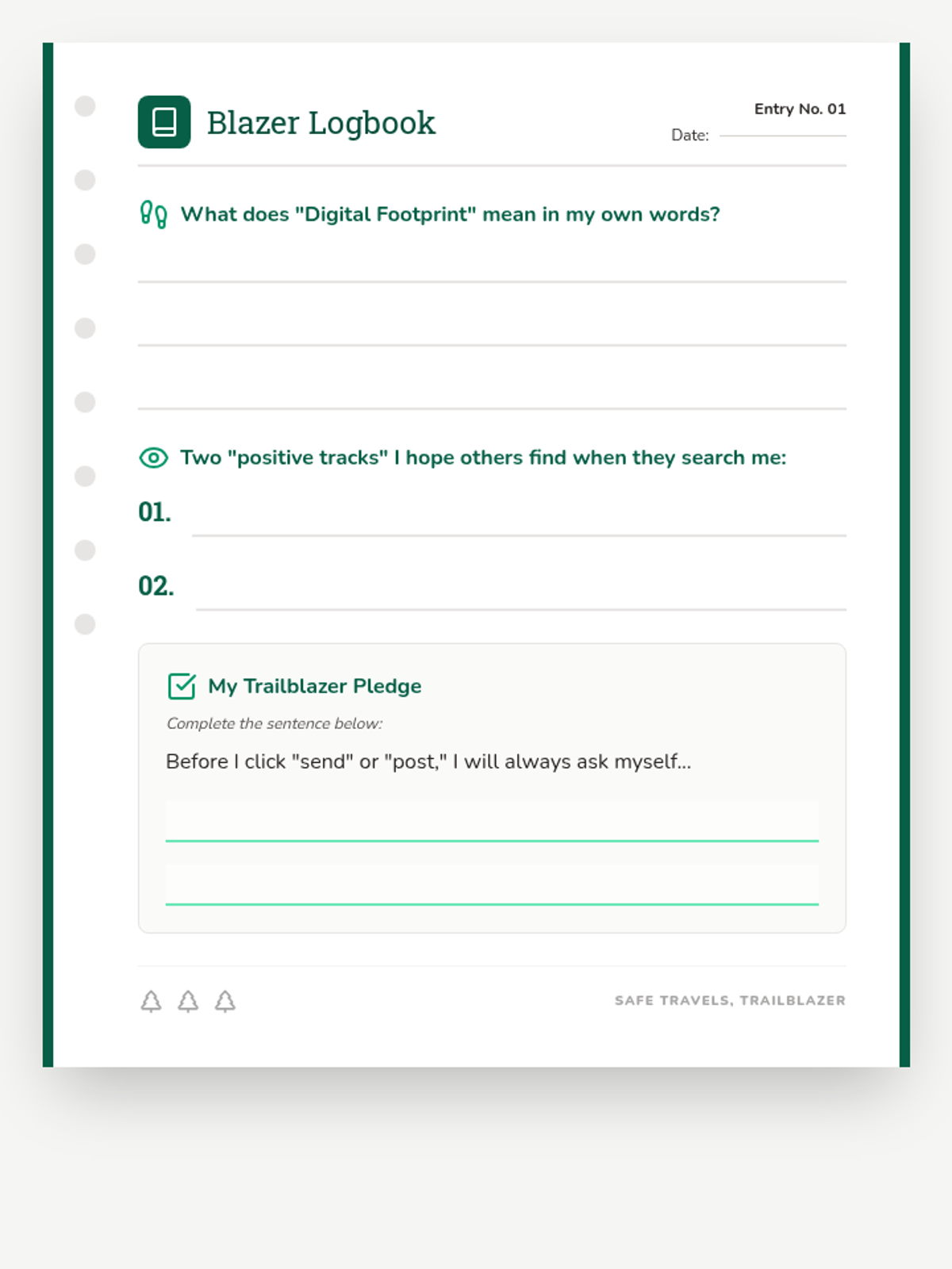 A reflection journal sheet for students to define their digital footprint and make a personal pledge to maintain a positive online trail.