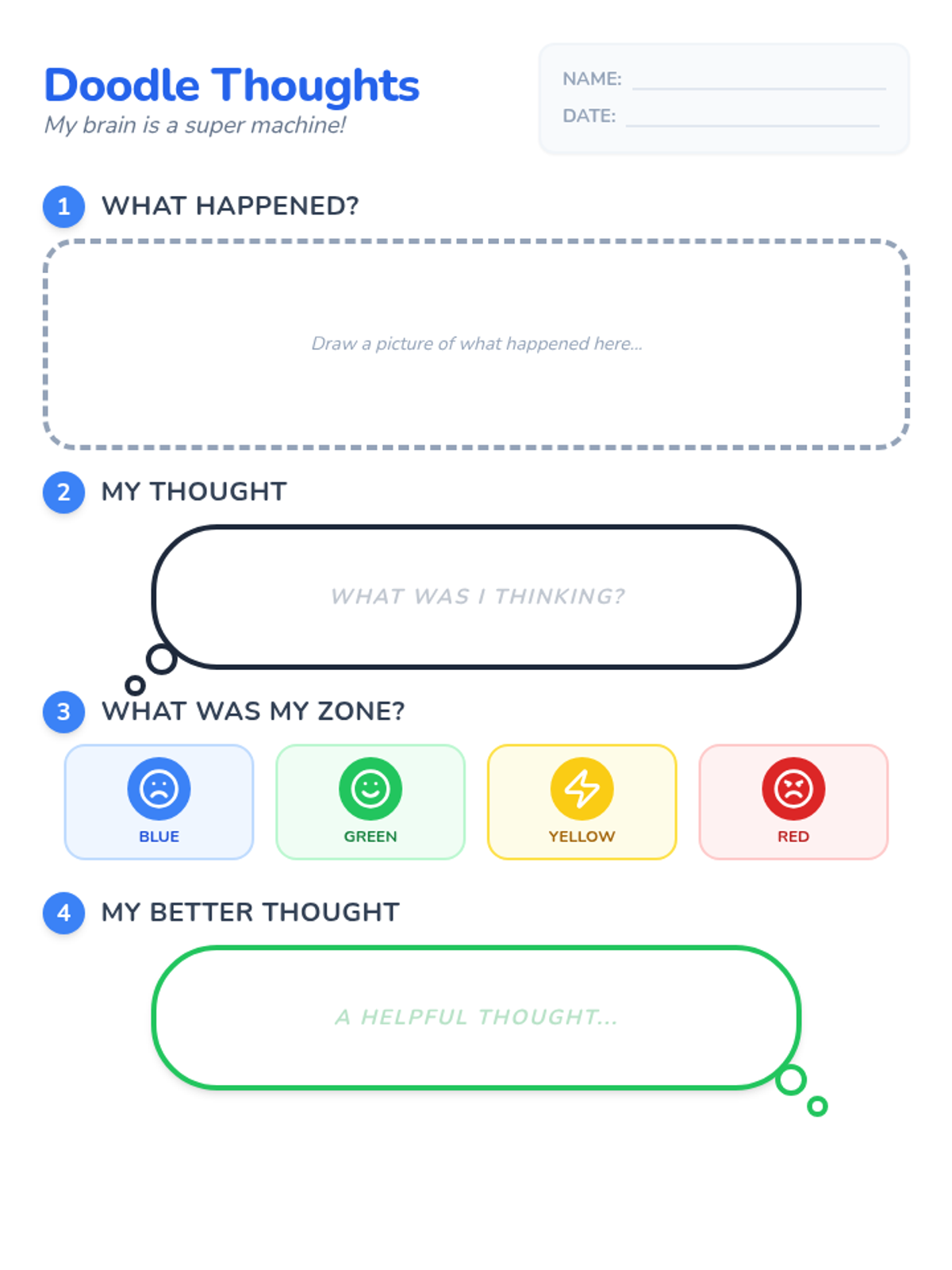 A highly visual worksheet for K-2 students to draw their situations, identify thoughts, and select an emotional zone using clear icons and simplified thought bubbles. Revised to fit on a single page with better contrast and logical flow.
