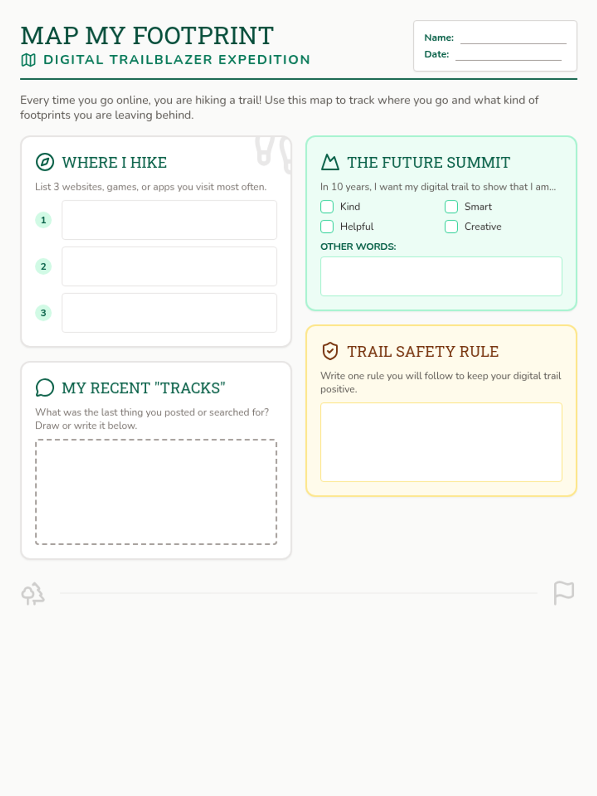 A student project sheet where children map their online activities, identify their "digital tracks," and set goals for a positive future online presence.