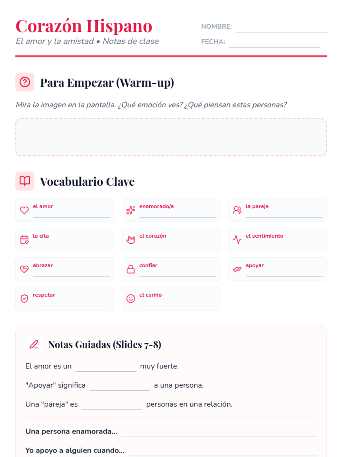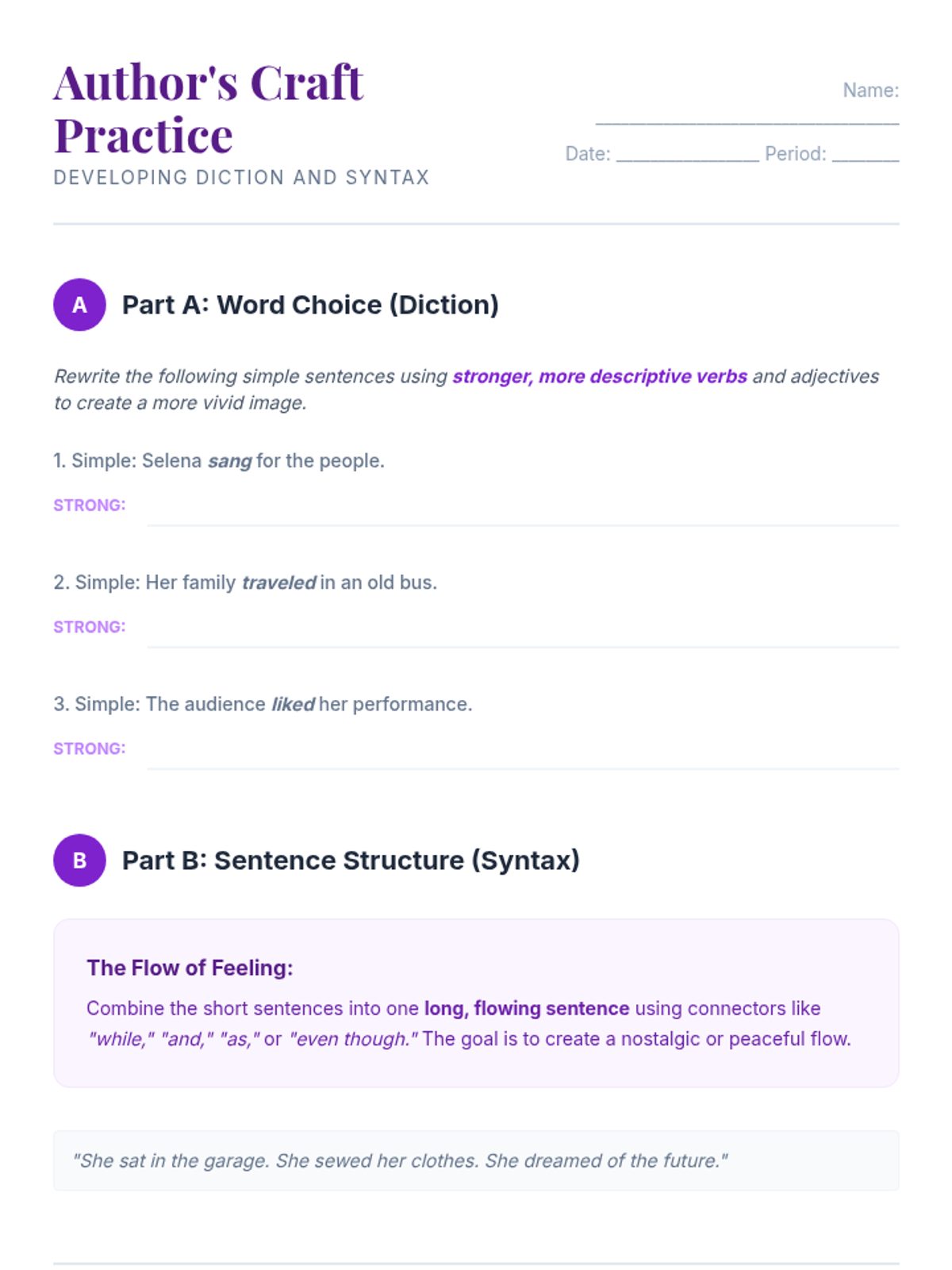 A student planning worksheet to help them prepare their interview script, select adjectives, and plan the use of logical connectors.