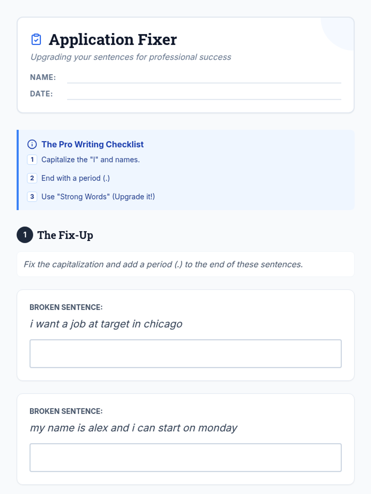 A student practice worksheet focused on fixing capitalization, punctuation, and upgrading casual sentences to professional 'Better' versions for job applications. Includes a 'Strong Words Bank' for support.