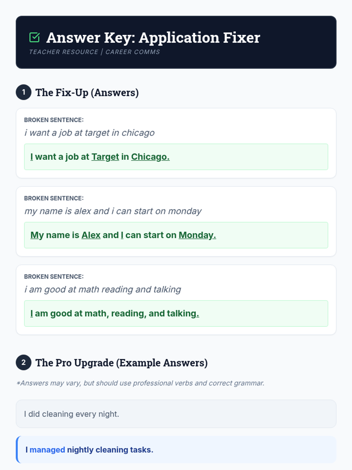 Teacher answer key for the Application Fixer Worksheet. Includes correct capitalization and punctuation for 'Fix-Up' sentences and professional model answers for the 'Pro Upgrade' section.