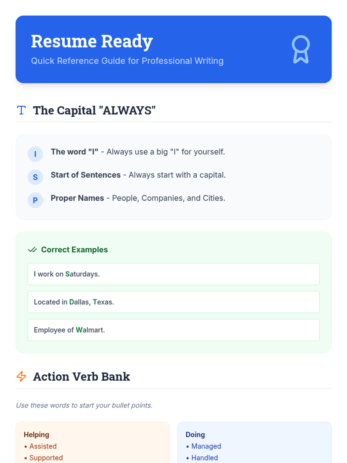 A visual cheat sheet for students containing essential capitalization rules, professional action verbs for resumes, and a punctuation quick-check guide. Designed to be a handy reference for application writing.