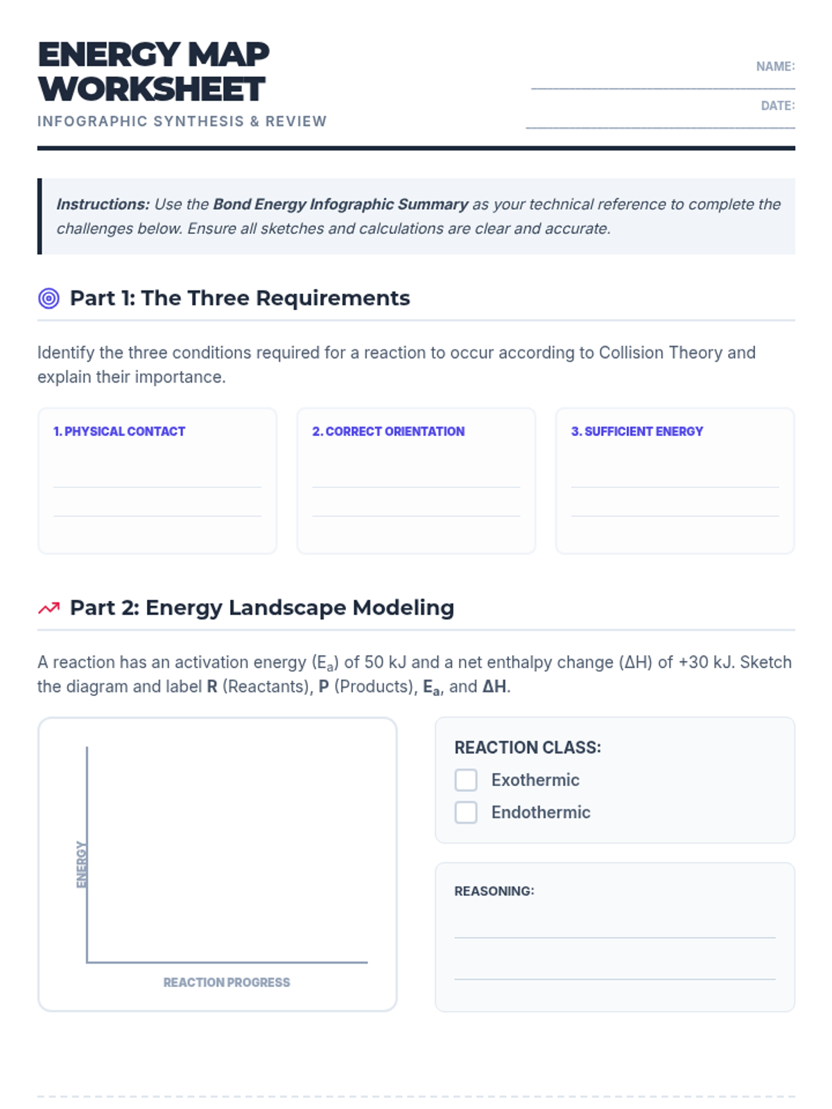 A high-impact infographic summary for the Energy in Chemical Bonds unit. It visualizes key concepts including Collision Theory, Enthalpy Diagrams with labeled humps (Ea and ΔH), Bond Energy mathematics, Hess's Law, Calorimetry, and reaction rate factors. Optimized for a single-page layout with robust HTML-based formulas and clear visuals.