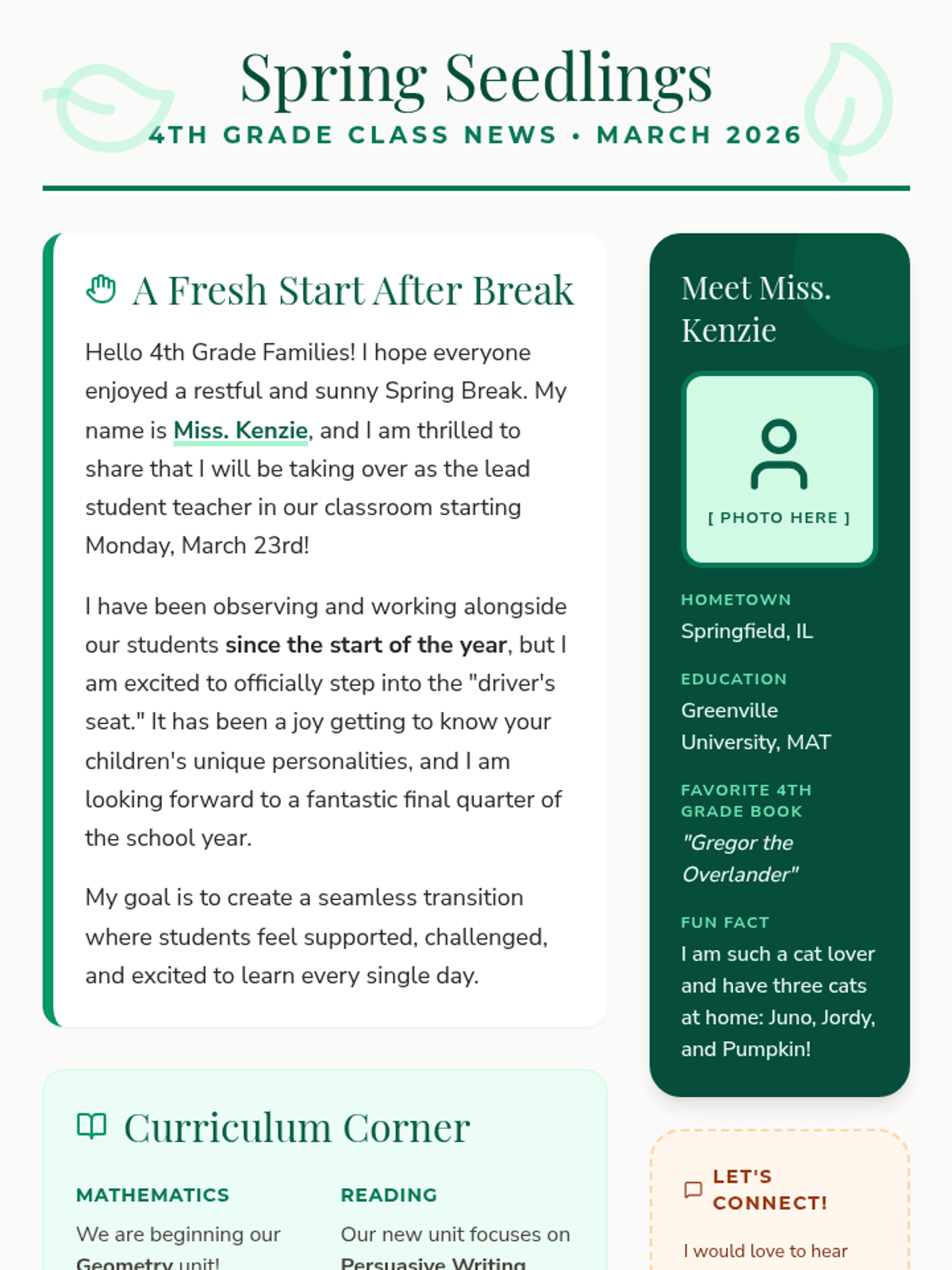 A professionally designed 4th-grade classroom newsletter featuring a 'Spring Seedlings' botanical theme. It introduces the student teacher (Miss. Kenzie) taking over after Spring Break, outlines upcoming curriculum goals in Math, Reading, Science, and Social Studies, and provides contact information and important dates.