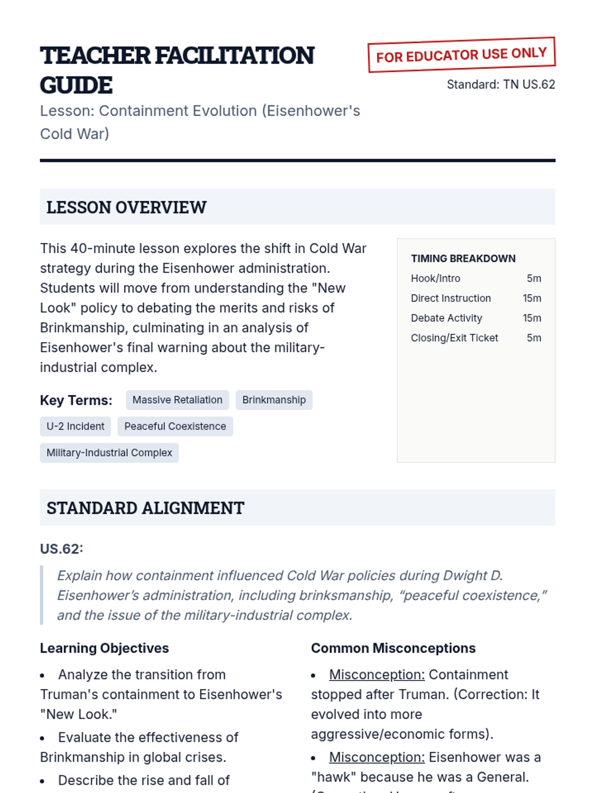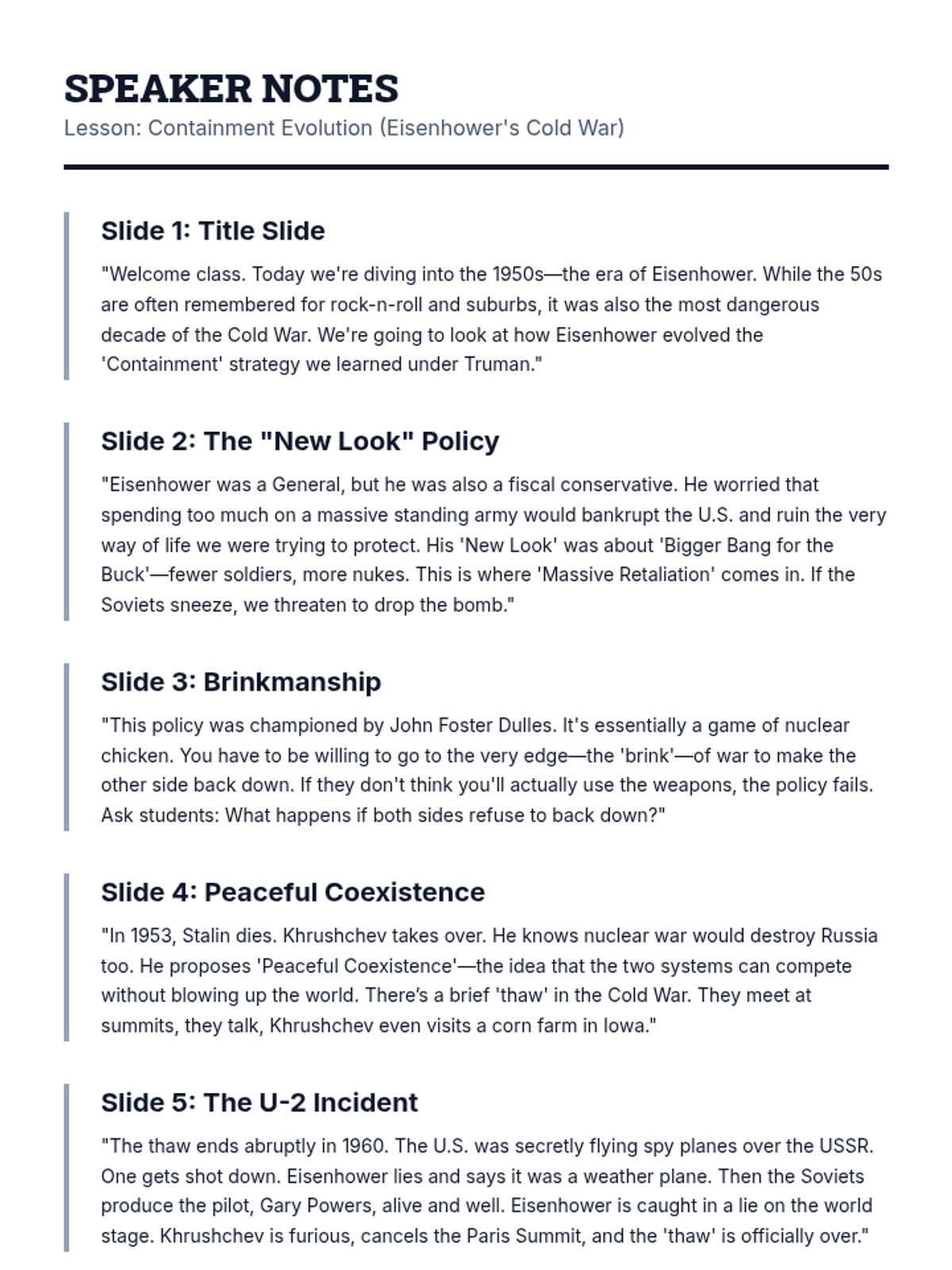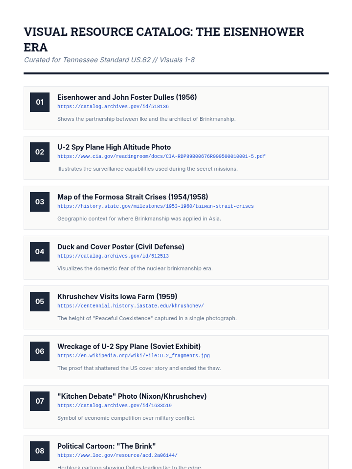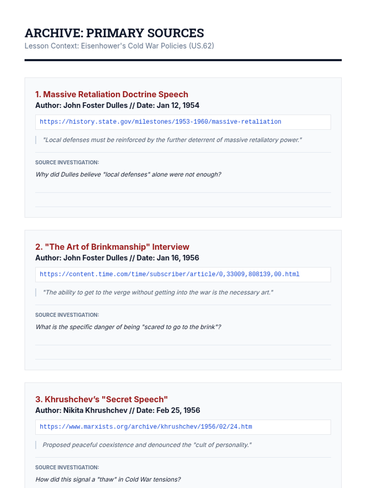 A curated list of primary sources for the Containment Evolution lesson, including speeches by Eisenhower, Dulles, and Khrushchev, with verified dates and official archive links.