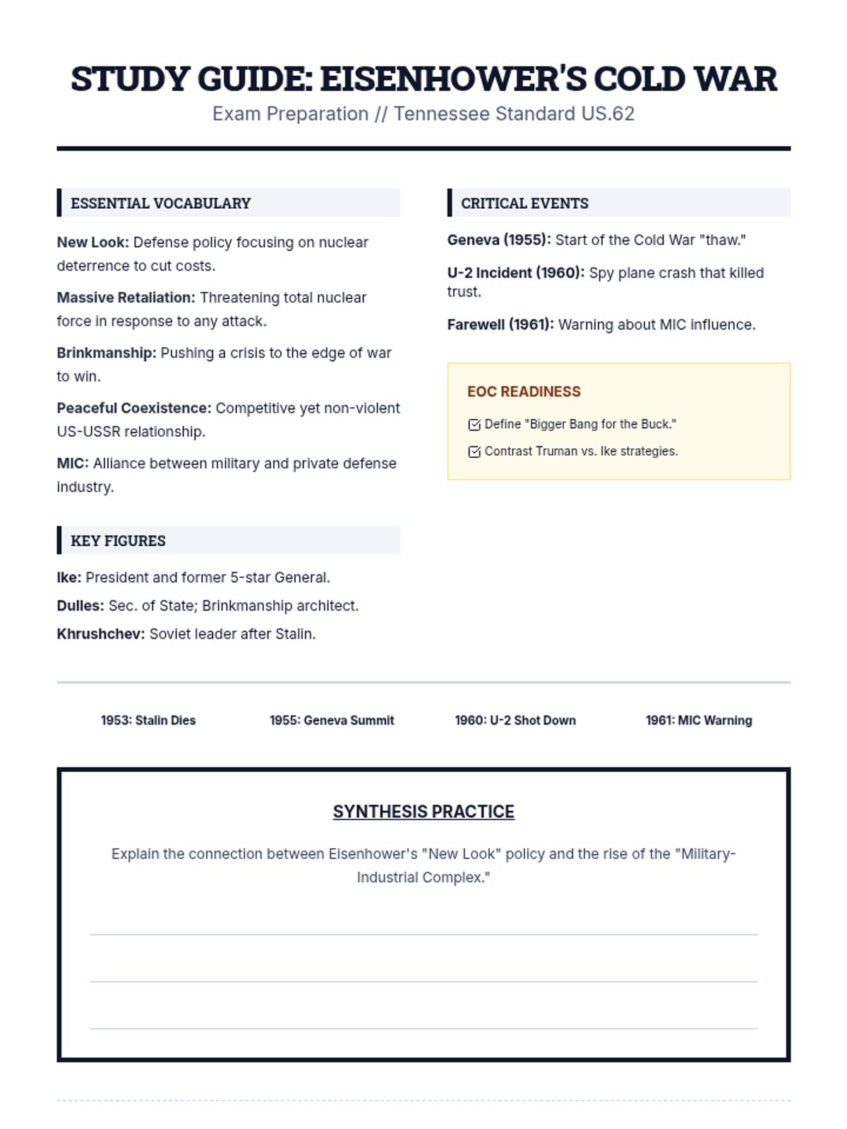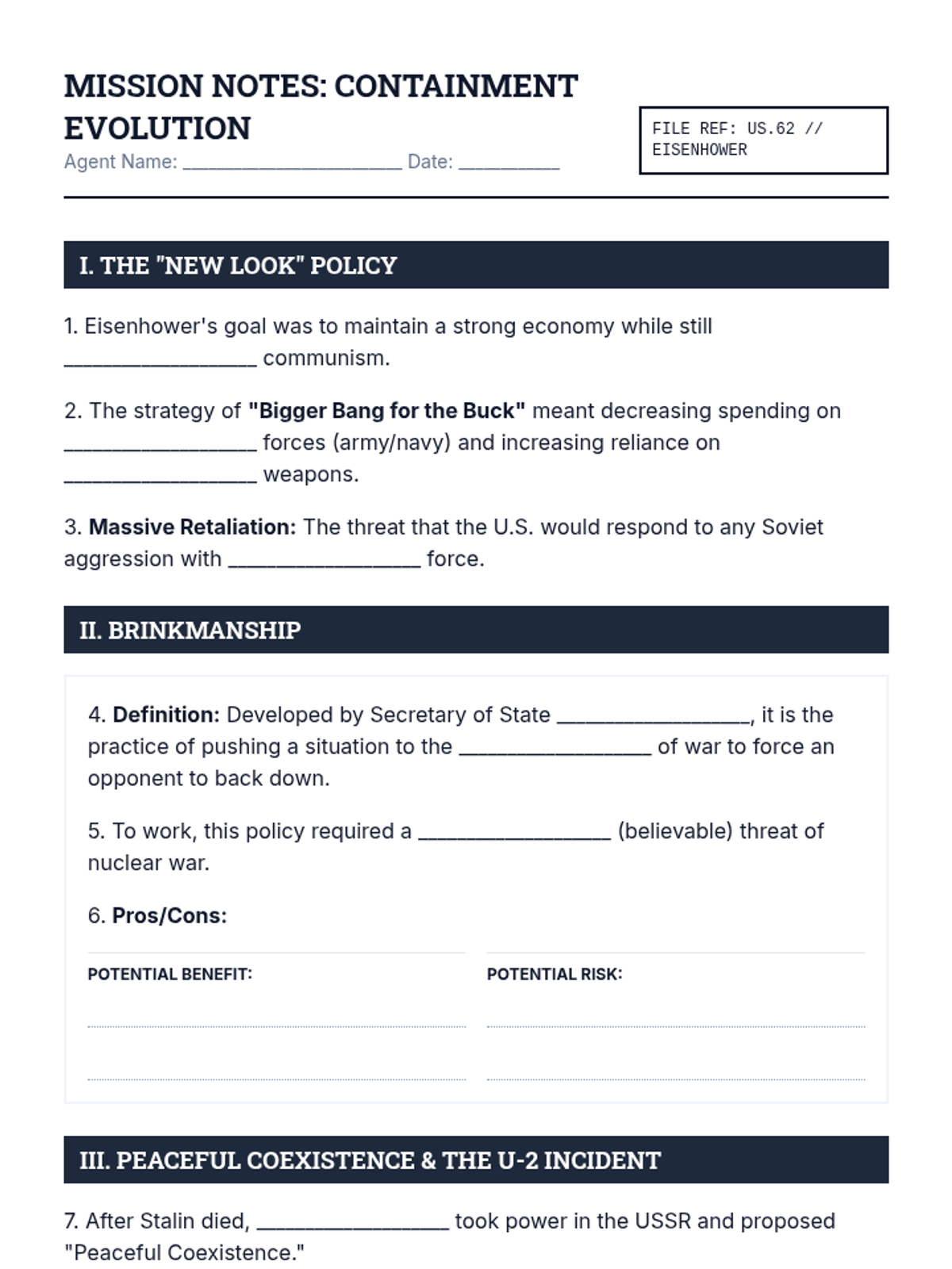 A high-impact visual presentation covering Eisenhower's Cold War policies (US.62), including the New Look, Brinkmanship, Peaceful Coexistence, and the Military-Industrial Complex. Features a 'Top Secret' dossier aesthetic.