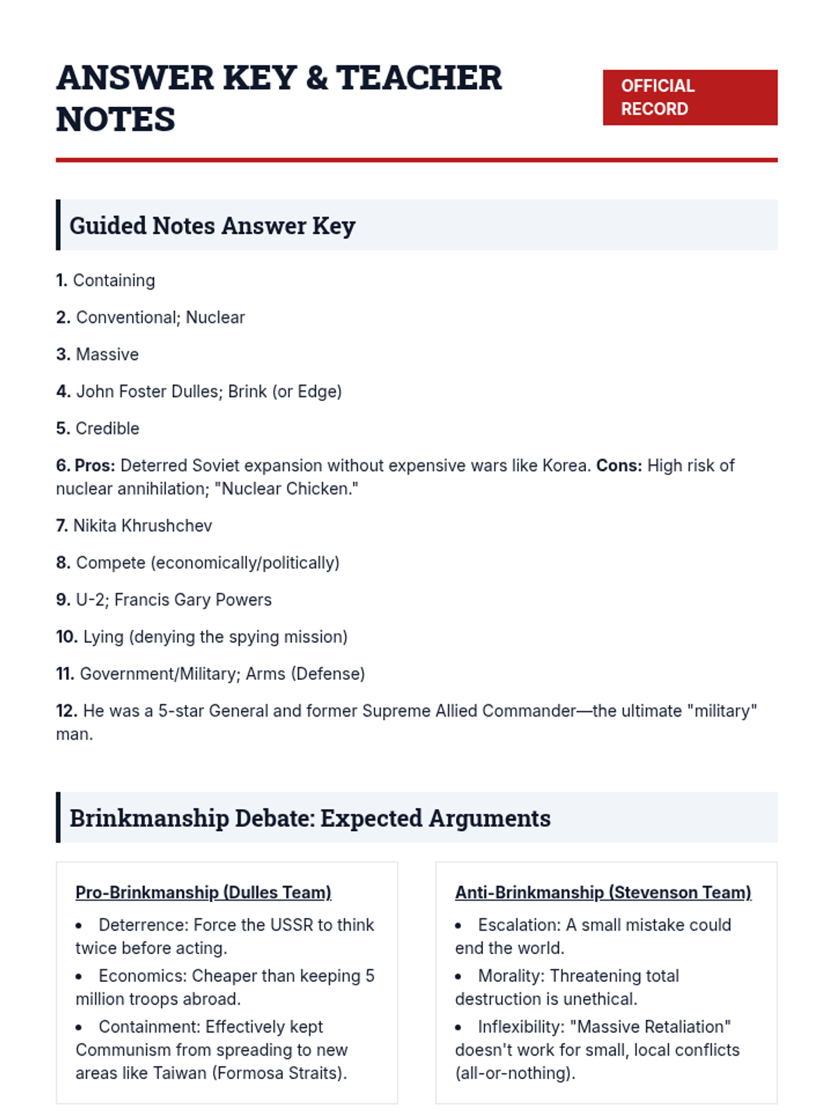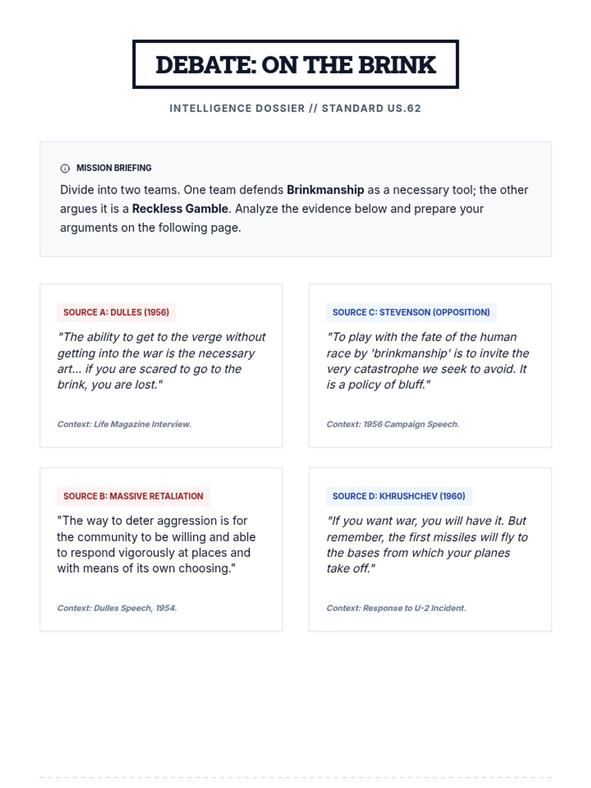 A small-group debate activity focusing on the merits and dangers of Brinkmanship. Includes primary source excerpts from John Foster Dulles, Adlai Stevenson, and Nikita Khrushchev for students to analyze and use as evidence.