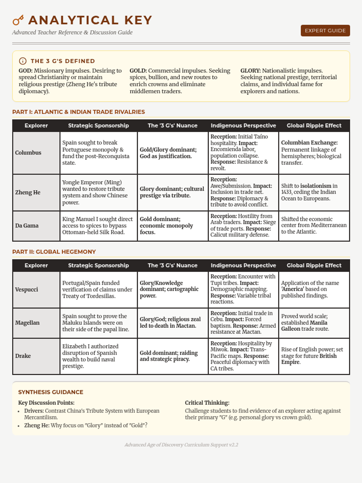 An advanced teacher's guide for the analytical voyager worksheet, featuring nuanced historical context, strategic motivations, and indigenous perspectives. Includes explicit definitions for the 3 G's framework for teacher reference. Revised to fit on a single page with improved text contrast.