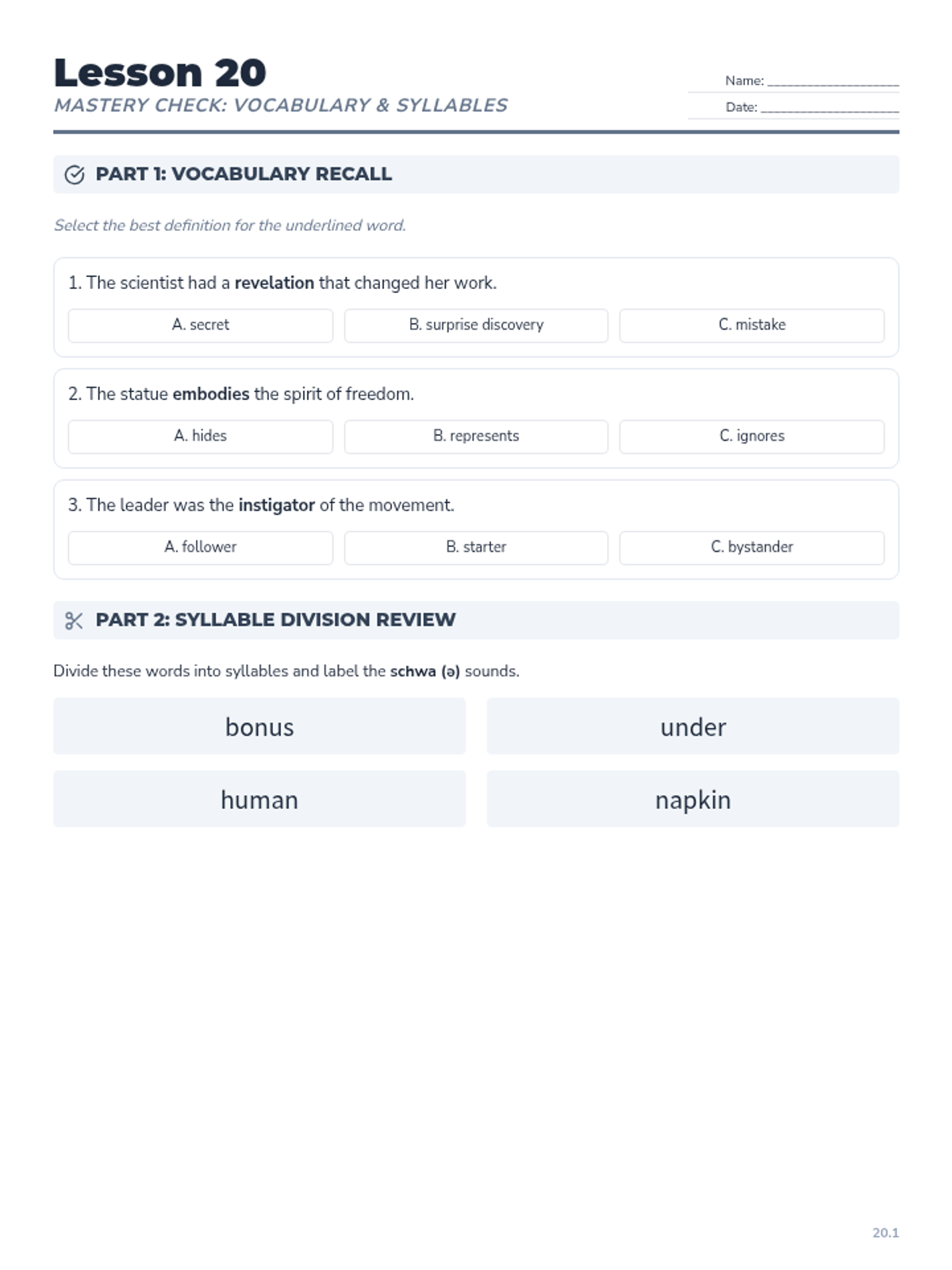 A comprehensive 4-page expansion for Lesson 20 of a reading intervention program. This review and synthesis handout covers academic vocabulary (revelation, embodies, instigator, etc.) and decoding skills (syllable division with schwa sounds). It features a vocabulary assessment, a reading passage ('The Power of Values'), critical thinking analysis, and a structured synthesis writing task with language frames. Designed for high school TESOL students.