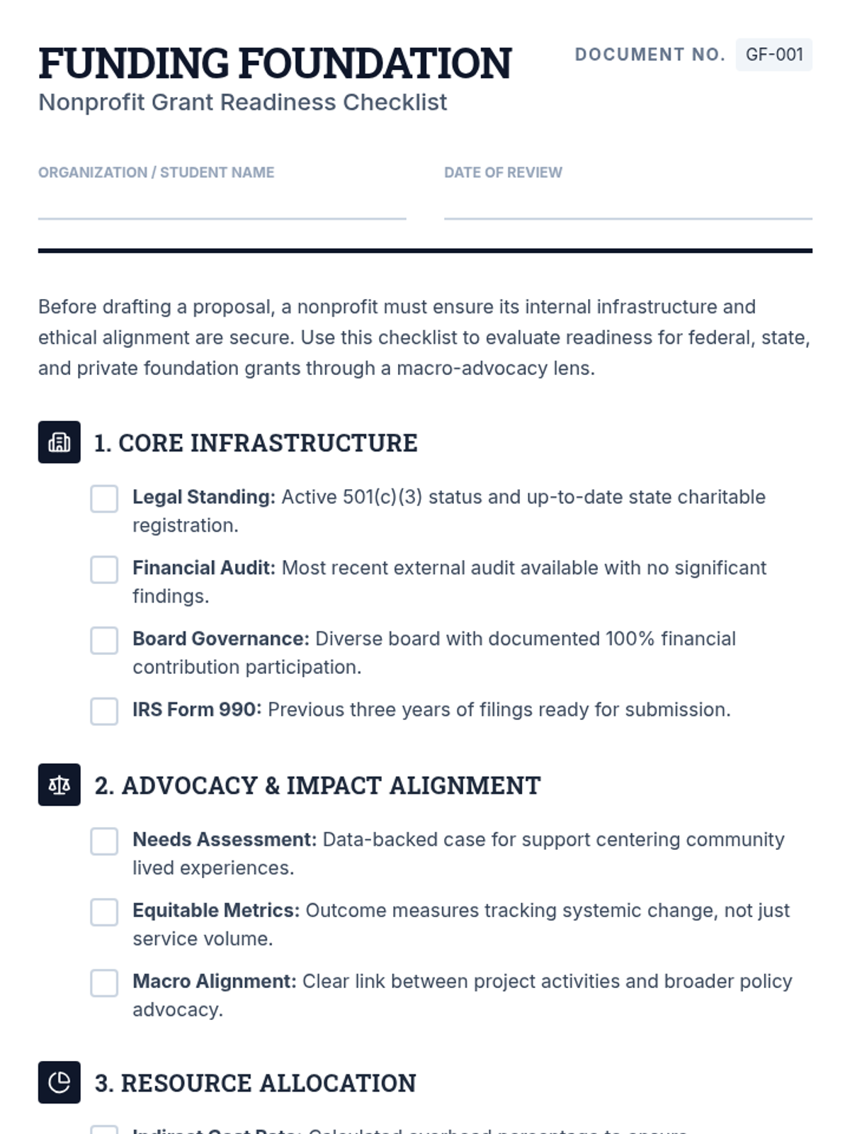 A comprehensive grant readiness checklist for nonprofit organizations, emphasizing organizational infrastructure, social justice impact, and ethical resource allocation.