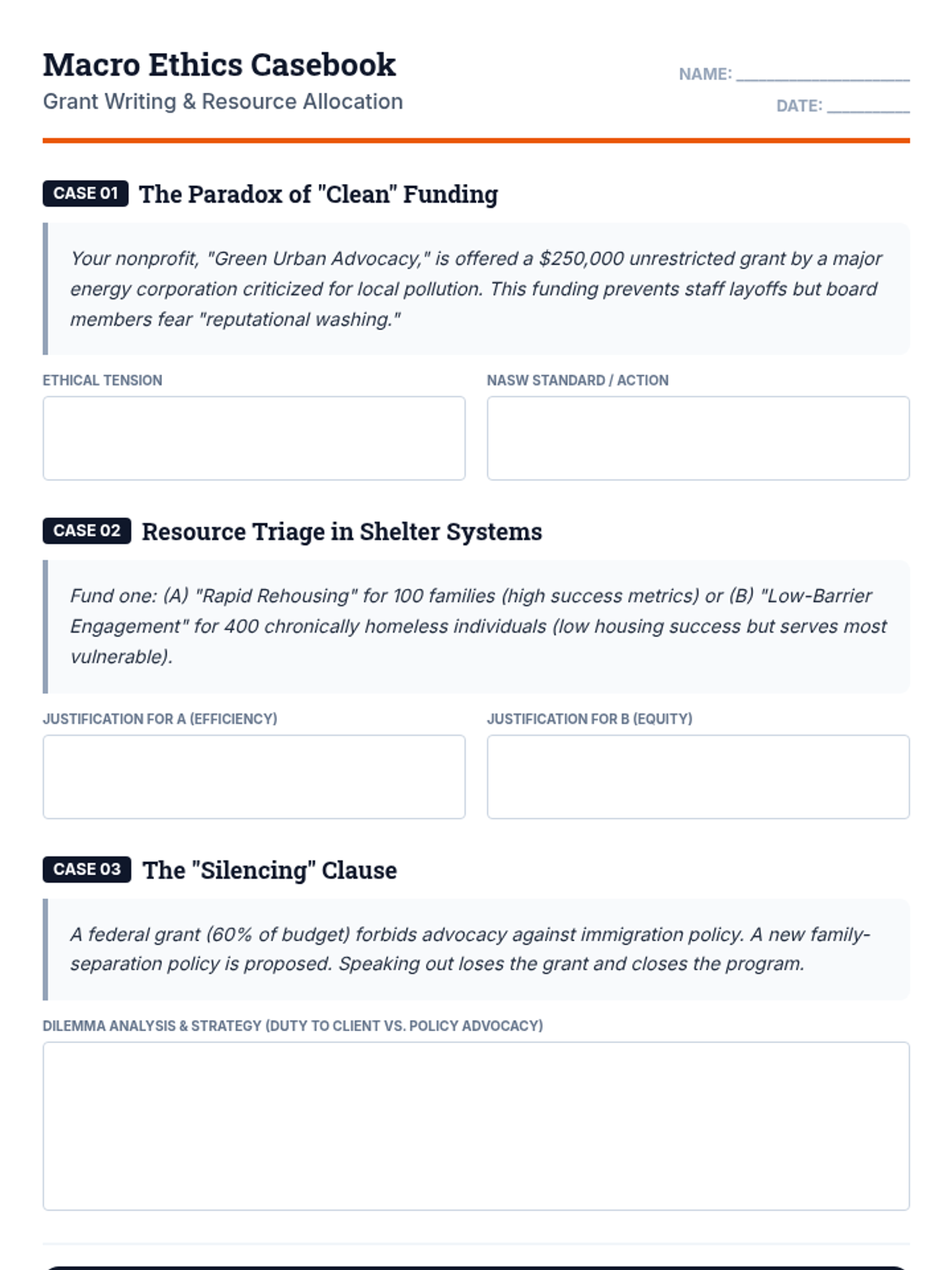 A student handout containing three complex social work ethics case studies focused on resource allocation, macro-level advocacy, and the dilemmas of nonprofit funding.