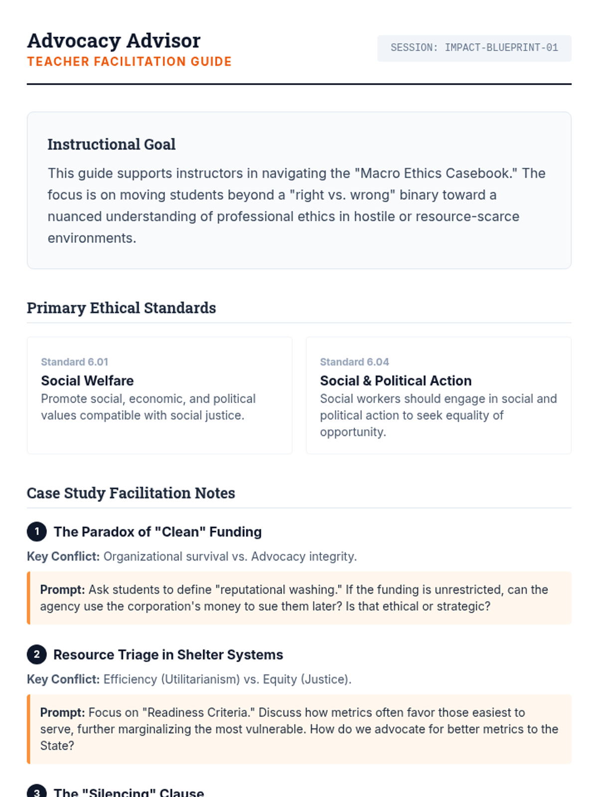 A facilitation guide for instructors, providing discussion prompts, NASW ethical standard alignment, and key takeaways for the macro ethics case studies.