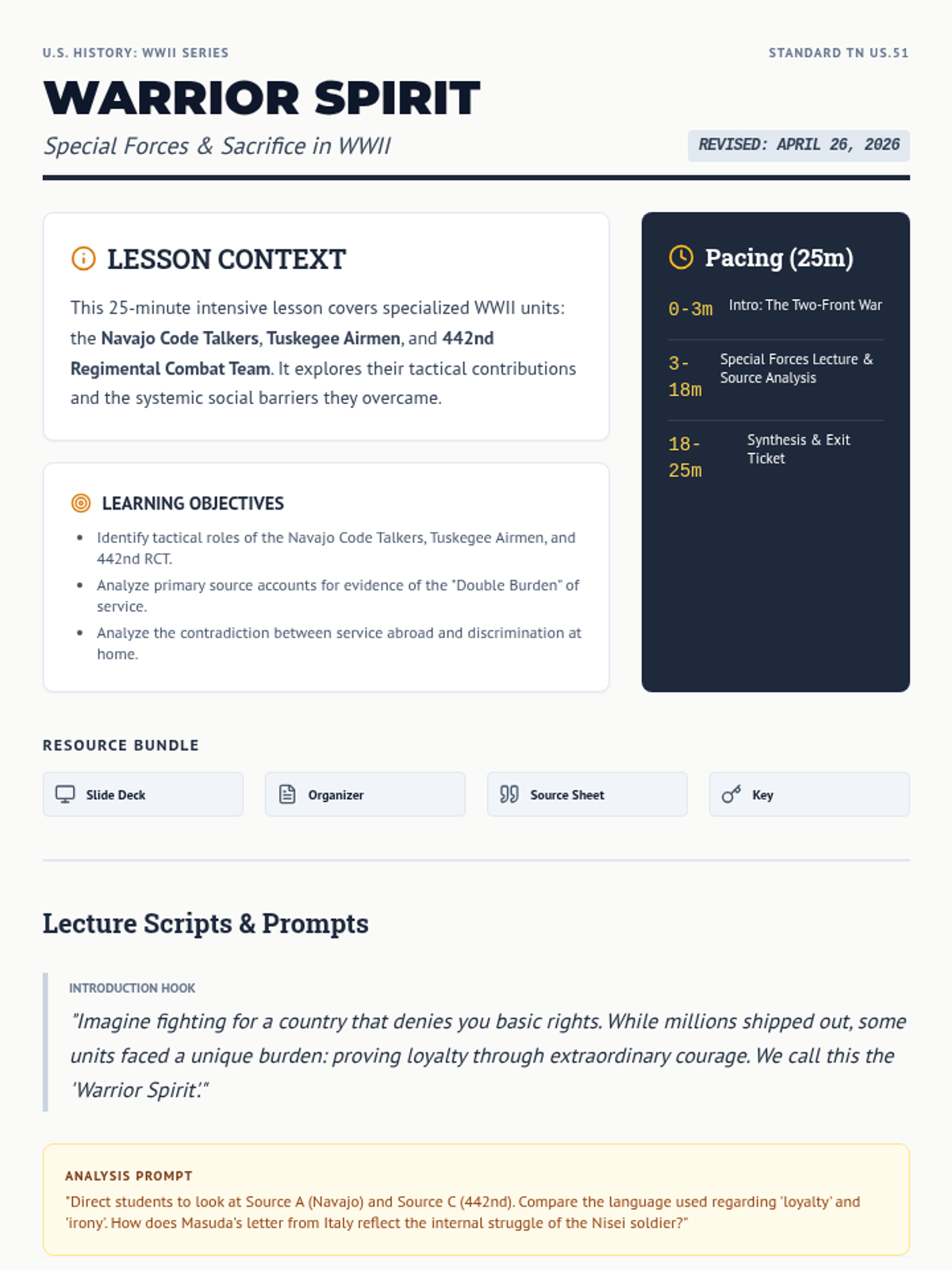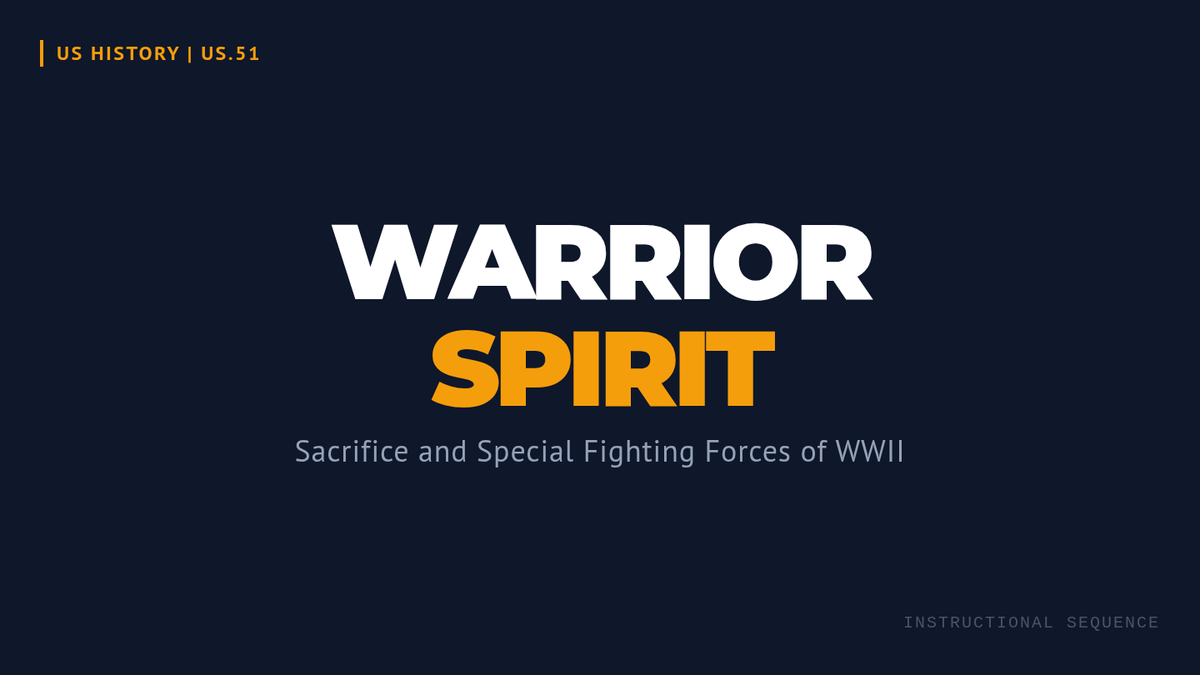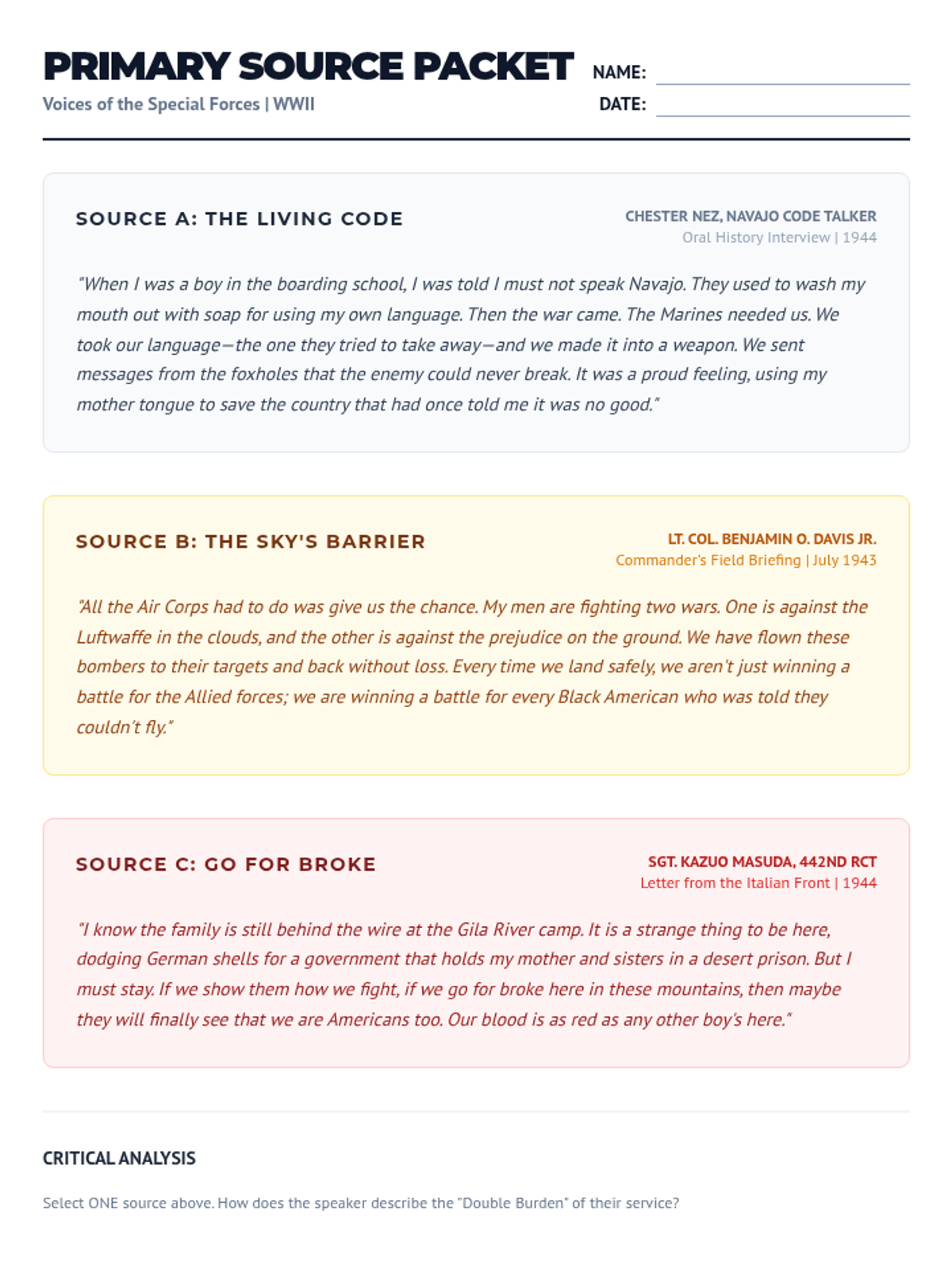 A primary source packet containing dated and named excerpts from a Navajo Code Talker, a Tuskegee Airman, and a 442nd RCT soldier, designed to complement the Warrior Spirit lesson.