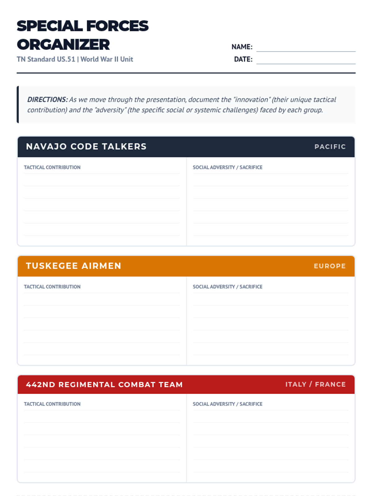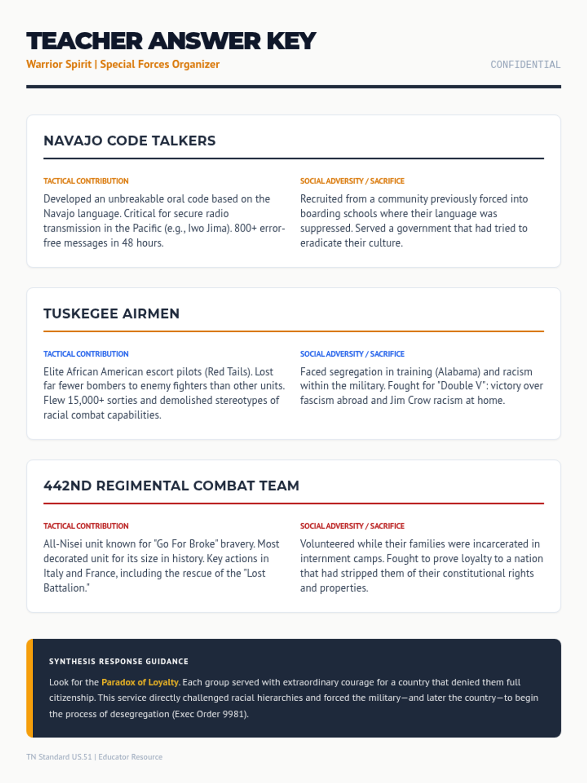 A comprehensive answer key for the Special Forces Organizer, providing detailed tactical contributions and social challenges for the Navajo Code Talkers, Tuskegee Airmen, and 442nd RCT.