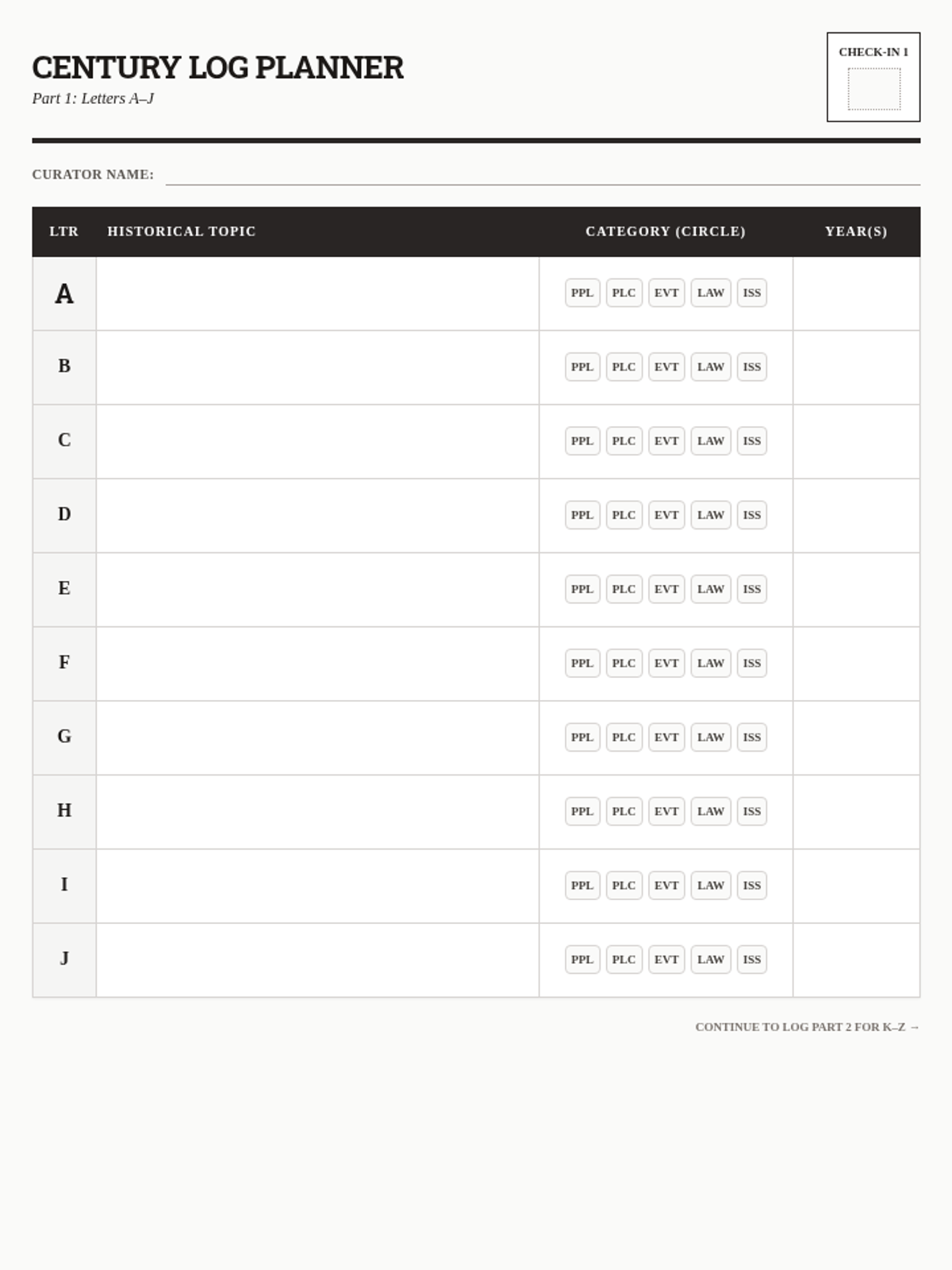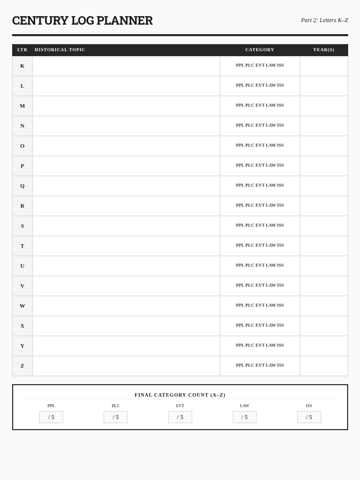 The second part of the Century Log planning template, covering letters K-Z and providing a category counter for students to ensure they follow the project constraints.