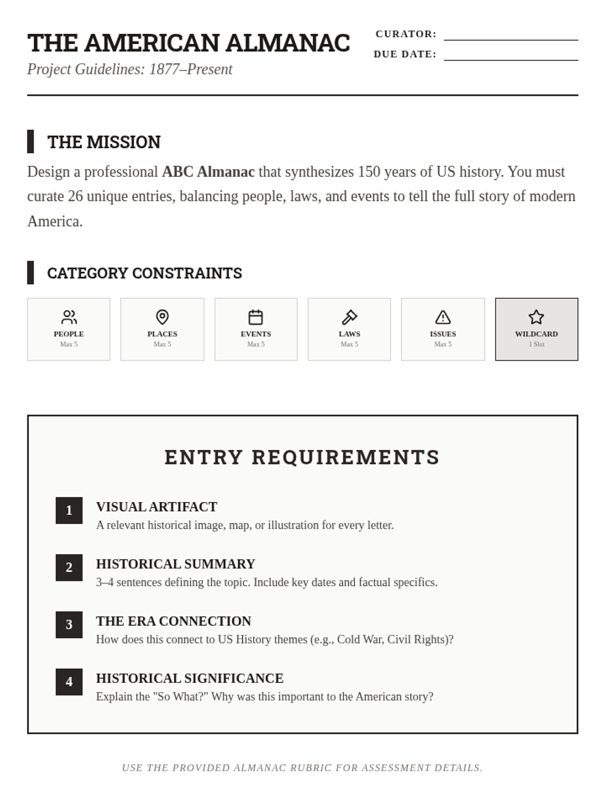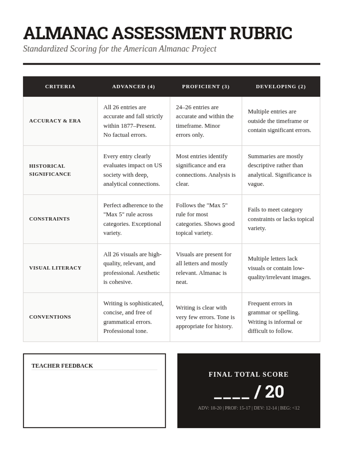 A detailed grading rubric for the American Almanac project, evaluating students on historical accuracy, synthesis/significance, adherence to constraints, visual quality, and writing conventions.