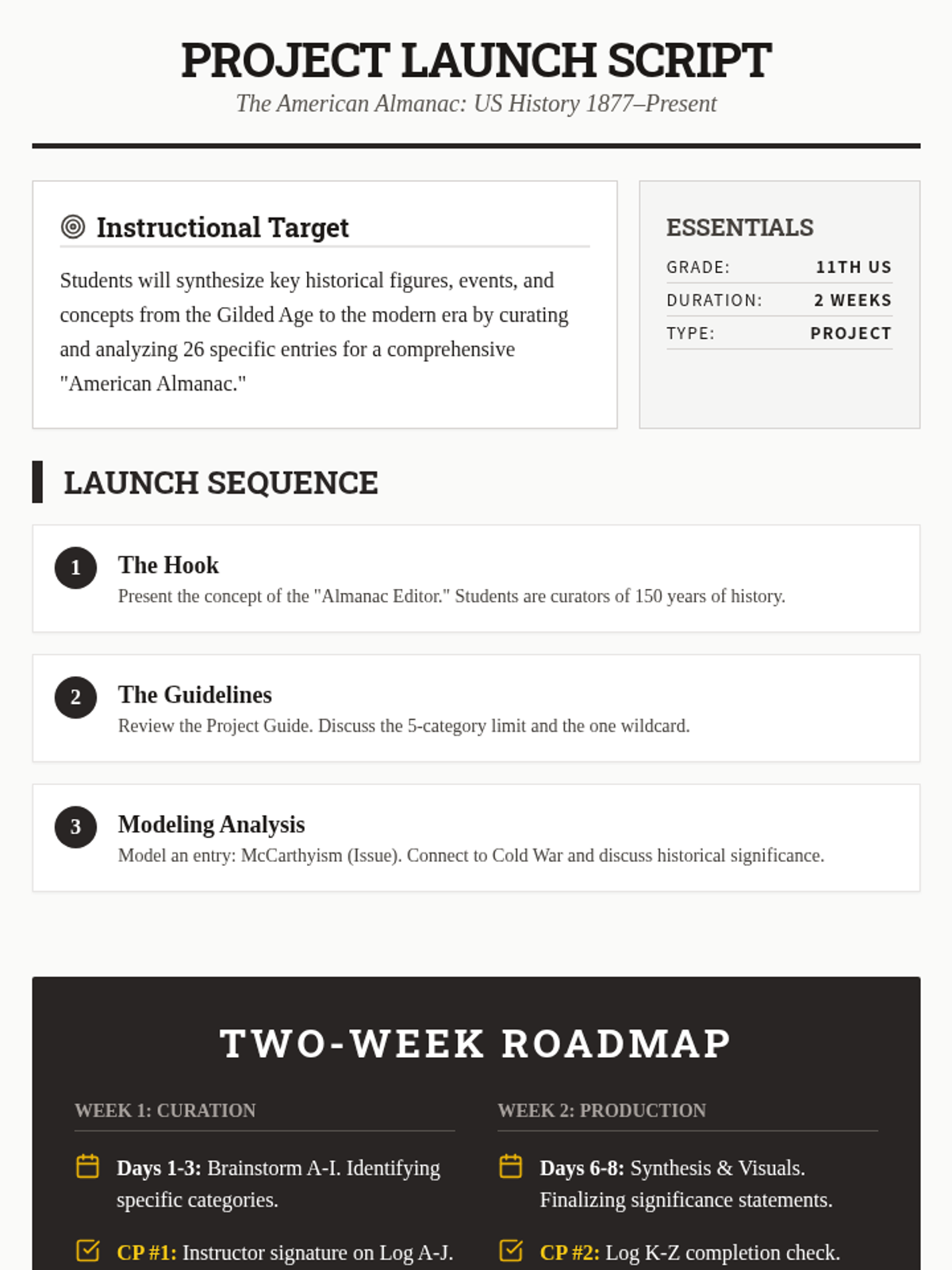 A comprehensive project launch script and lesson plan for the American Almanac ABC project, including a detailed two-week roadmap and teacher facilitation strategies.