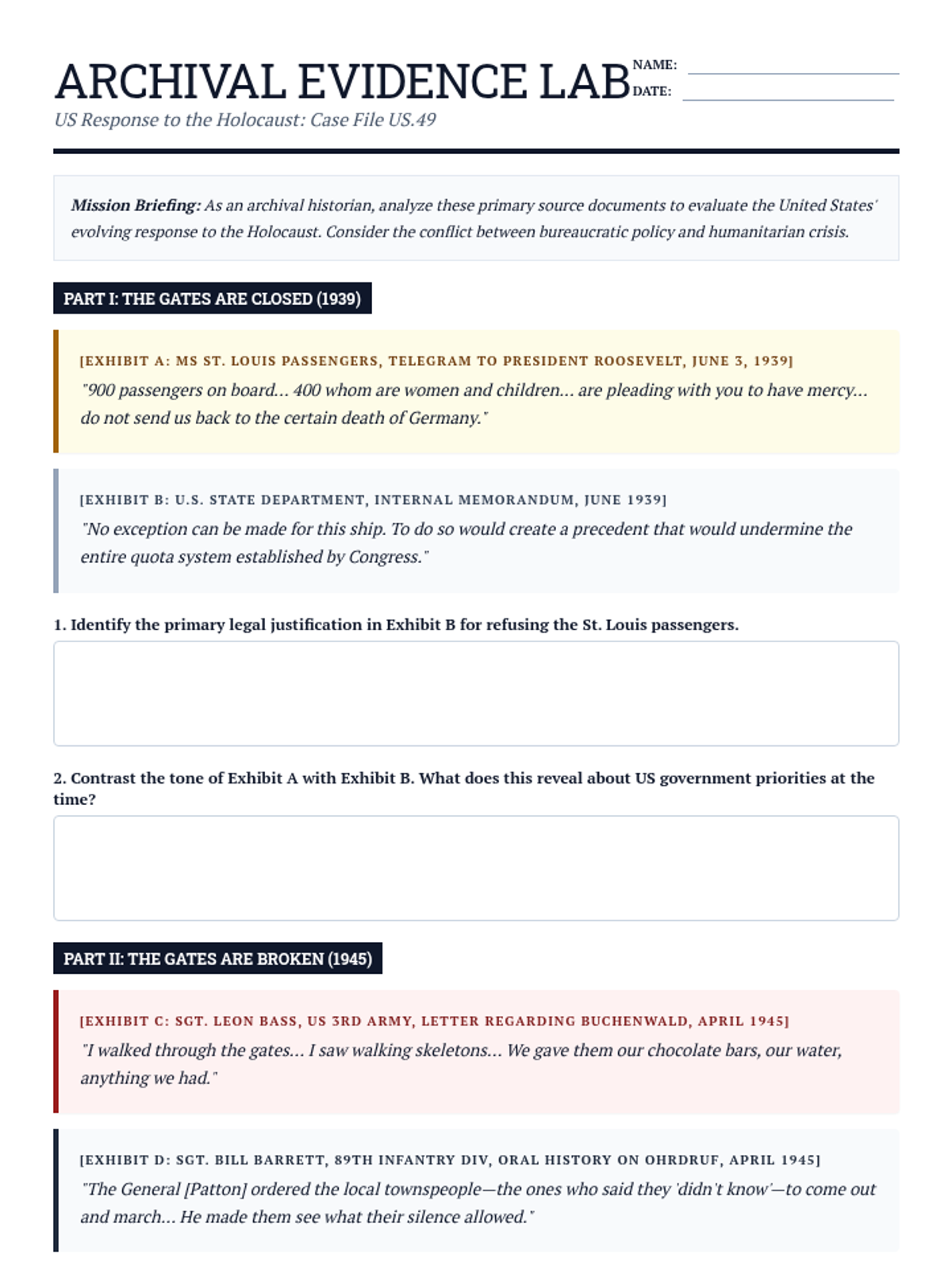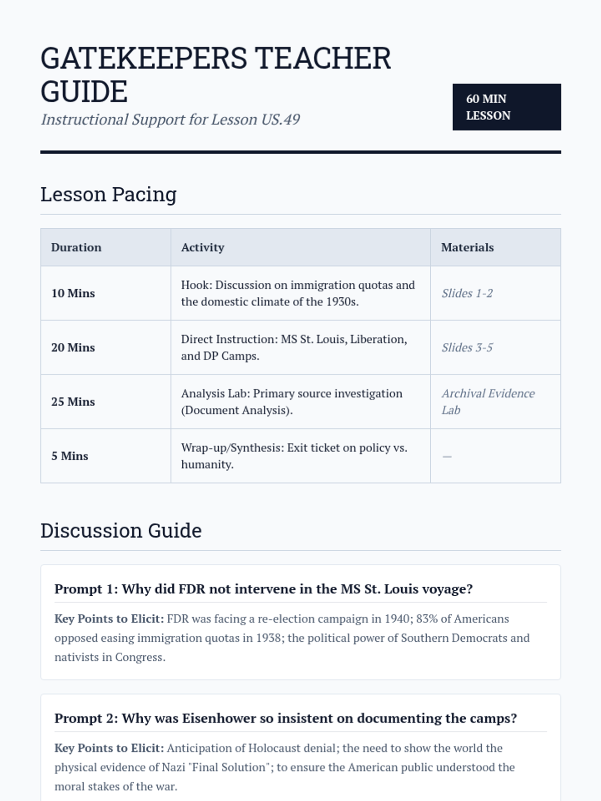 A comprehensive teacher's guide for the lesson on the US response to the Holocaust. Includes a minute-by-minute pacing guide, discussion prompts with expected student responses, an answer key for the Archival Evidence Lab, and differentiation strategies.
