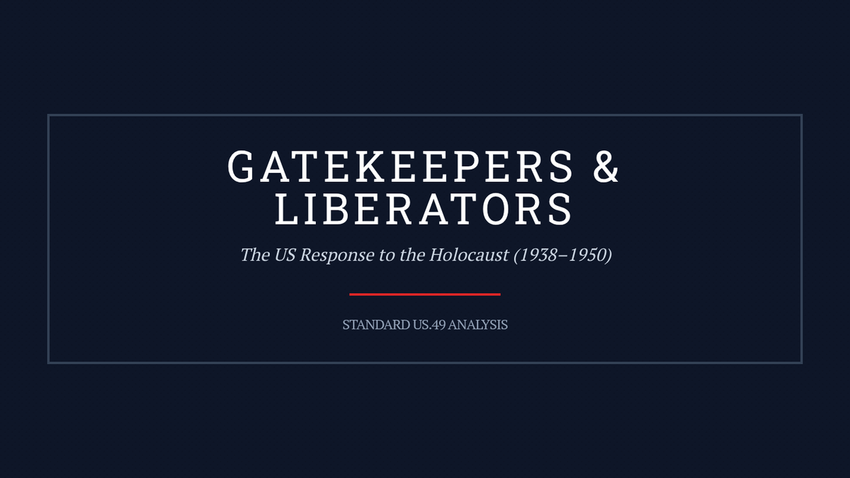 A visual presentation covering the US response to the Holocaust across three distinct phases: pre-war immigration policy (MS St. Louis), the liberation of camps by the US Army, and post-war survivor immigration/DP camps. Includes teacher lecture notes in the metadata.