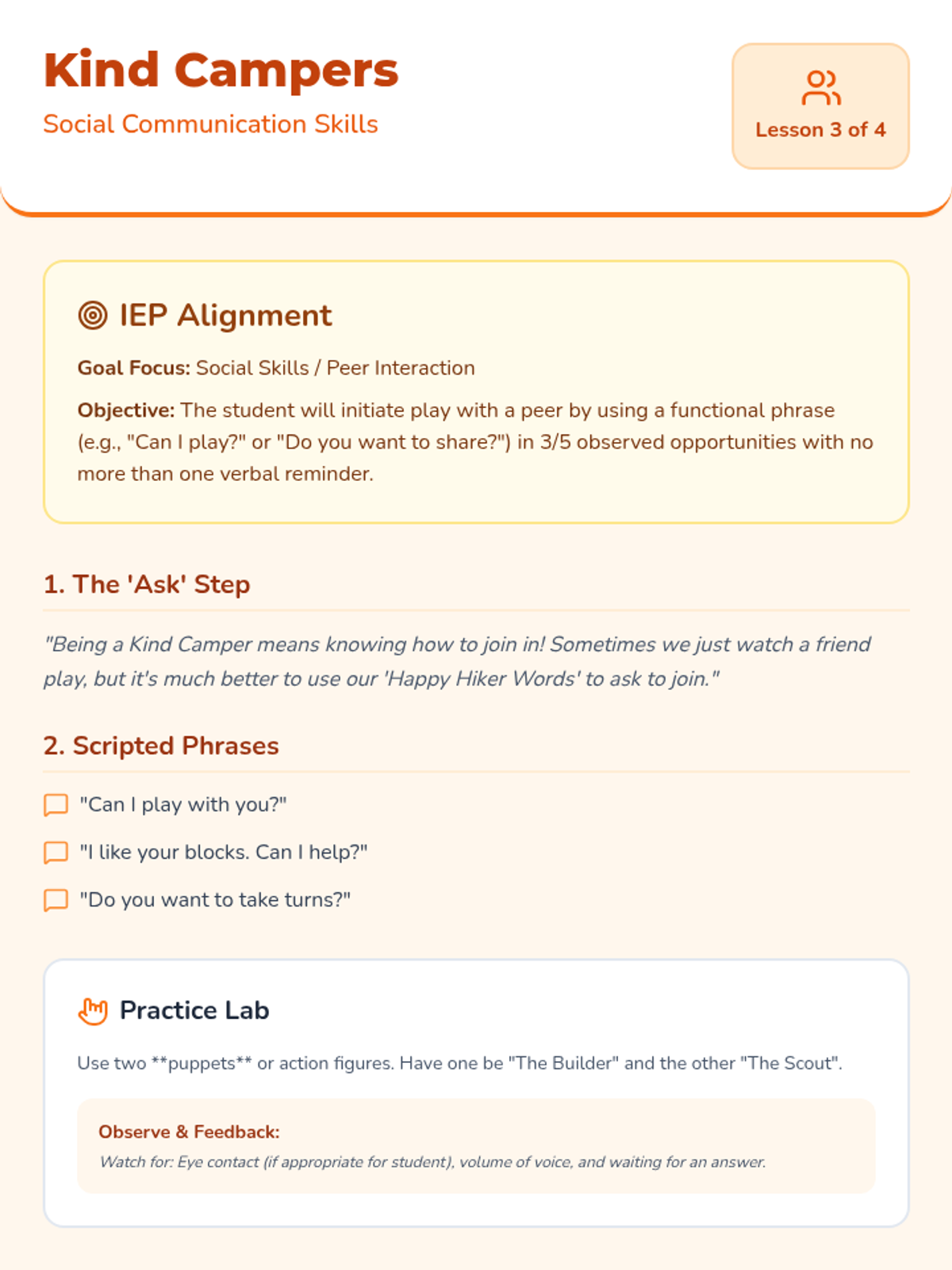 Teacher guide for Lesson 3 on social communication. Features scripted initiation phrases, puppet role-play ideas, and an observation checklist for tracking peer interactions.