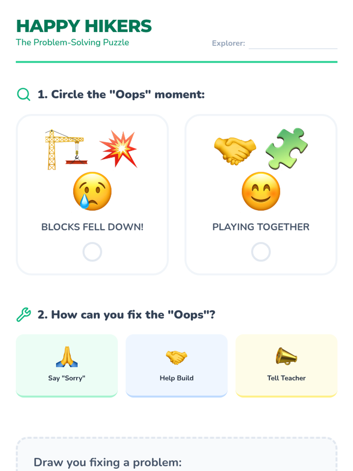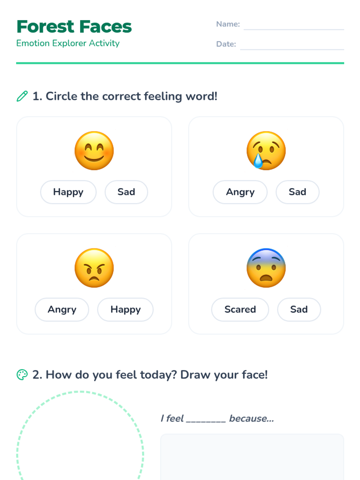 A student worksheet for Lesson 1 featuring emotion recognition practice with emojis and a large drawing area for self-expression.