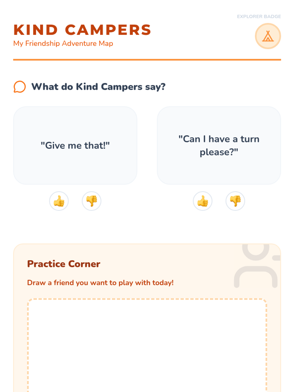 A student worksheet for Lesson 3 focusing on social communication. Includes a 'thumbs up/down' judgment activity for kind phrases and a drawing space for practicing social initiation.