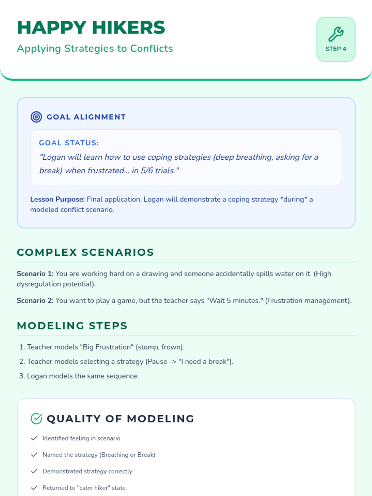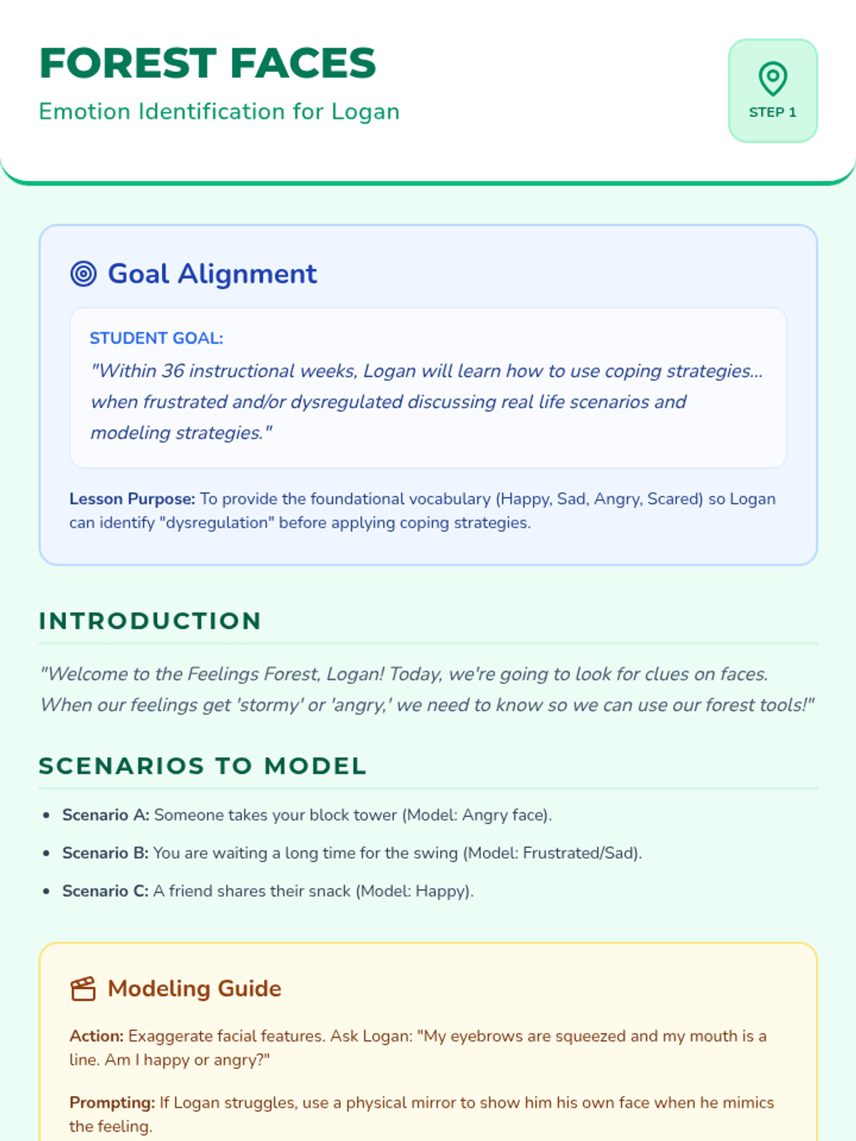 A professional teacher guide for Lesson 1, specifically tailored to Logan's IEP goal for emotion identification and modeling scenarios.