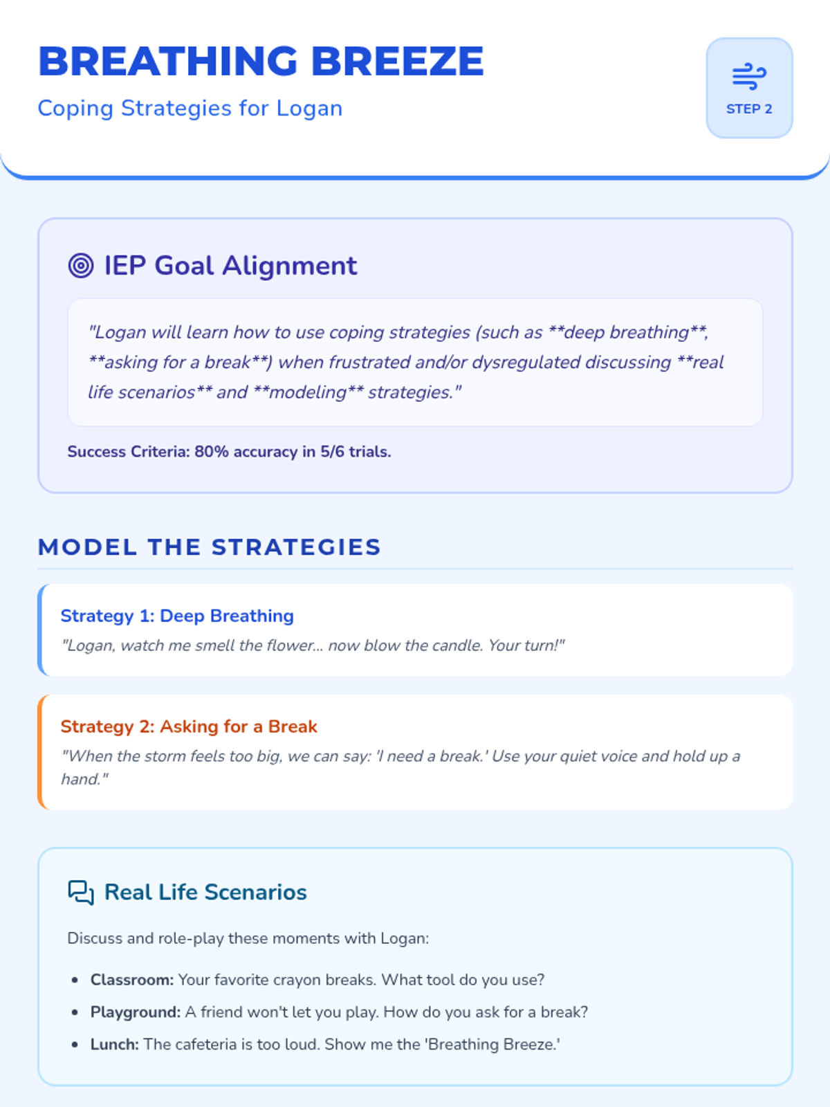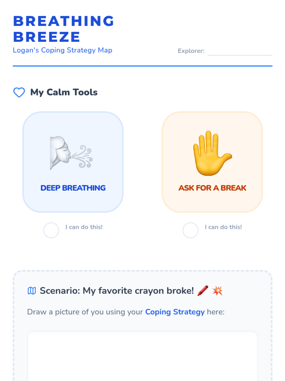 Student activity sheet for Logan featuring visual representations of deep breathing and asking for a break, with a specific scenario for practice.