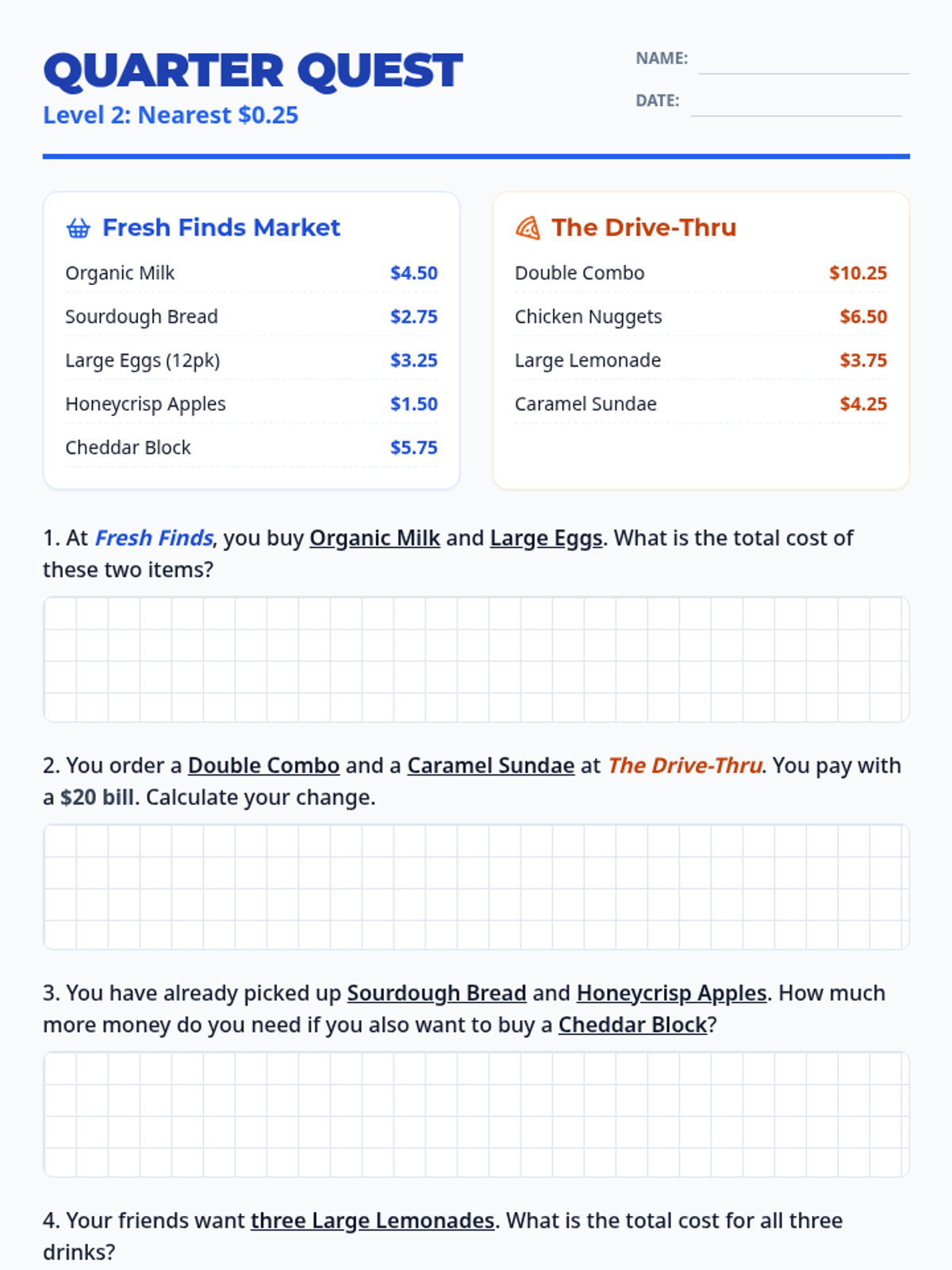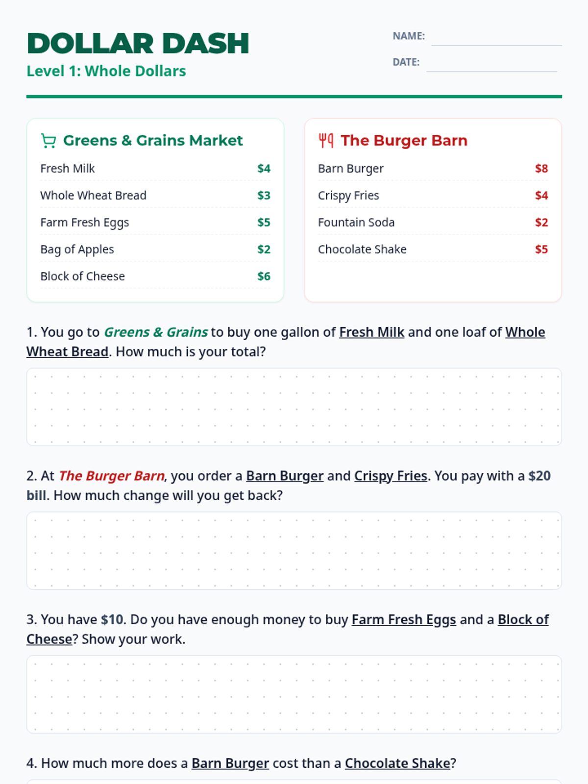 Level 1 math handout focusing on adding and subtracting whole dollar amounts using grocery and fast food themes. Revised for better page layout and work areas.