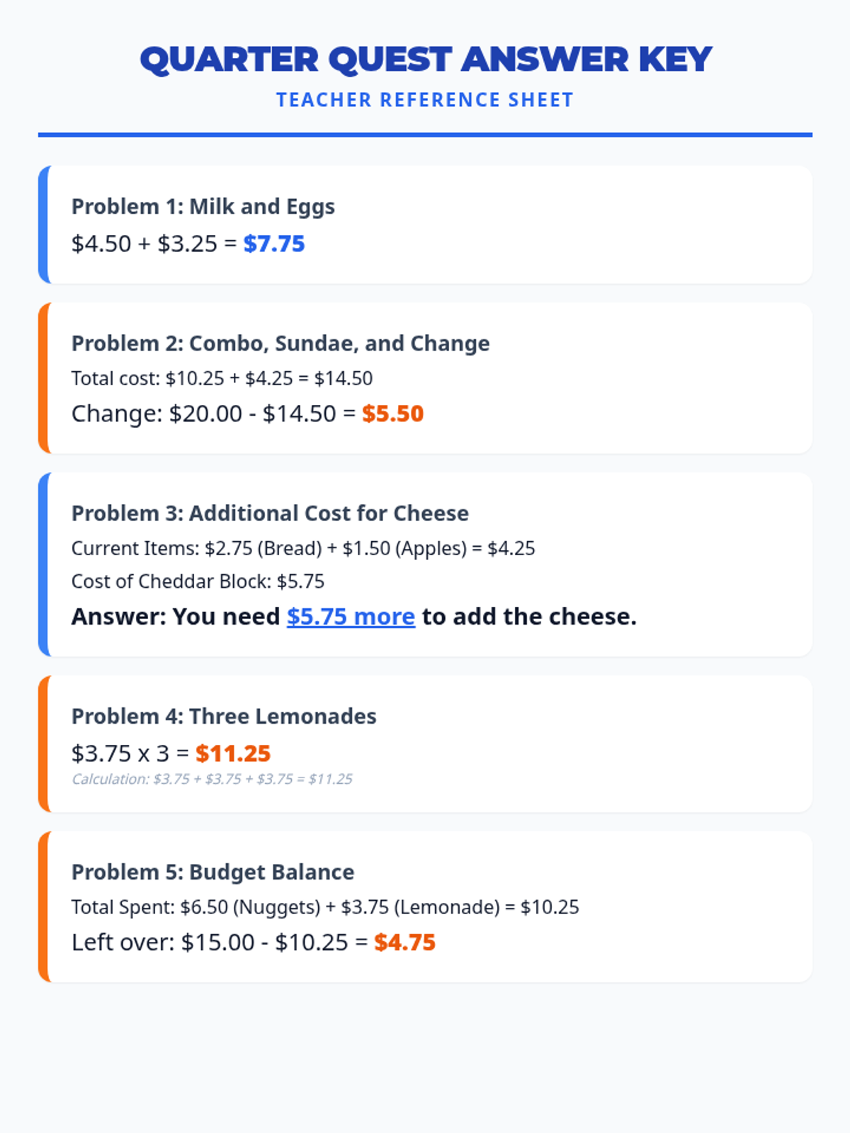 Answer key for the Level 2 Quarter Quest Handout. Revised to fix page breaks and clarify Problem 3 phrasing.