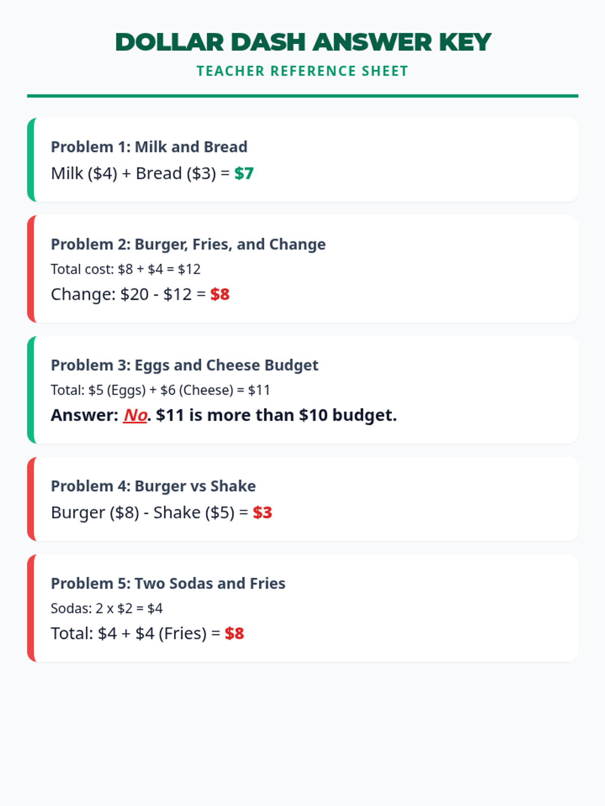 Answer key for the Level 1 Dollar Dash Handout. Revised to fix page breaks and layout spacing.
