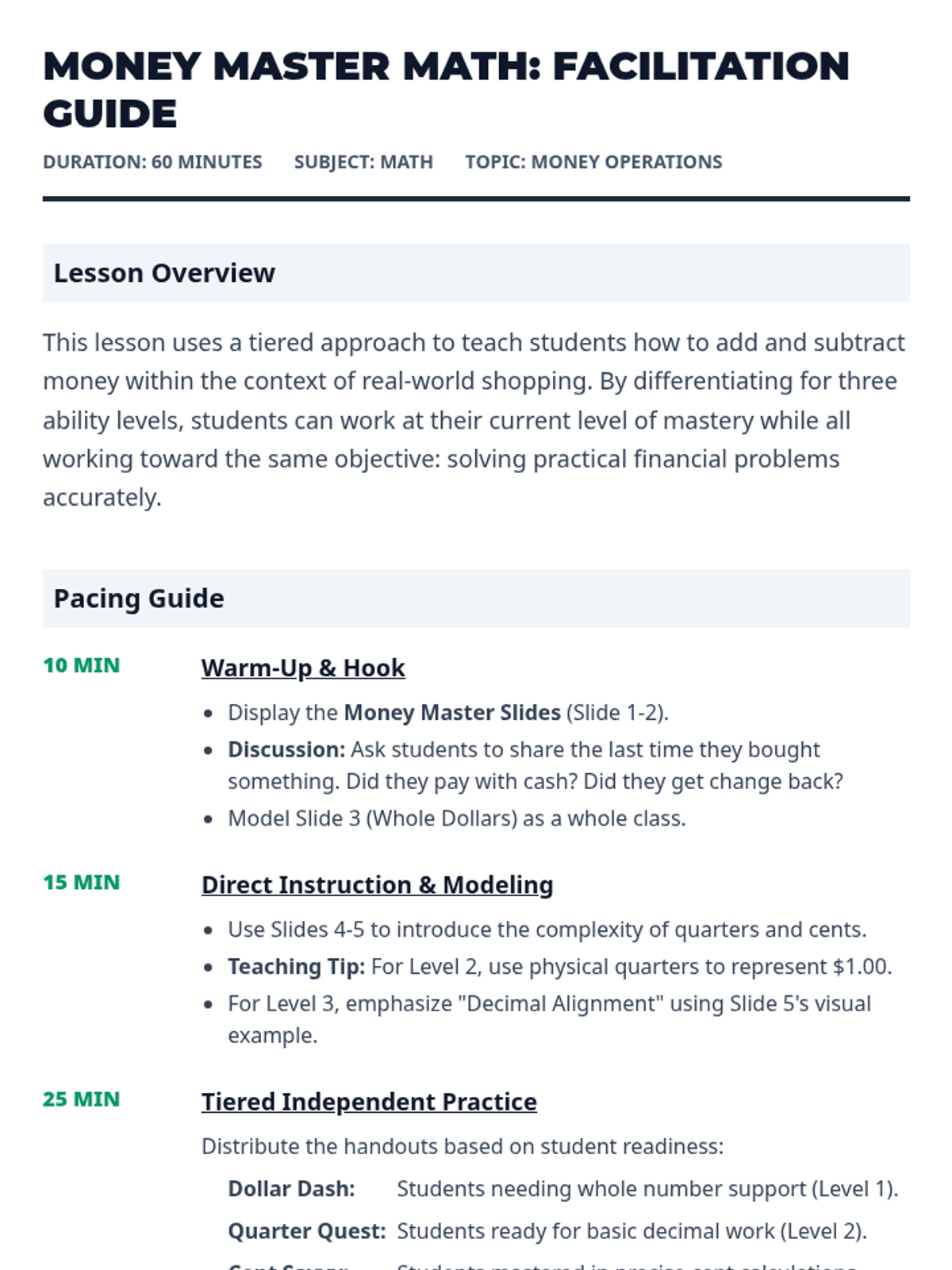 A refined facilitation guide for a 60-minute tiered math lesson on money, with improved layout, page-break handling, and vertical icon alignment.