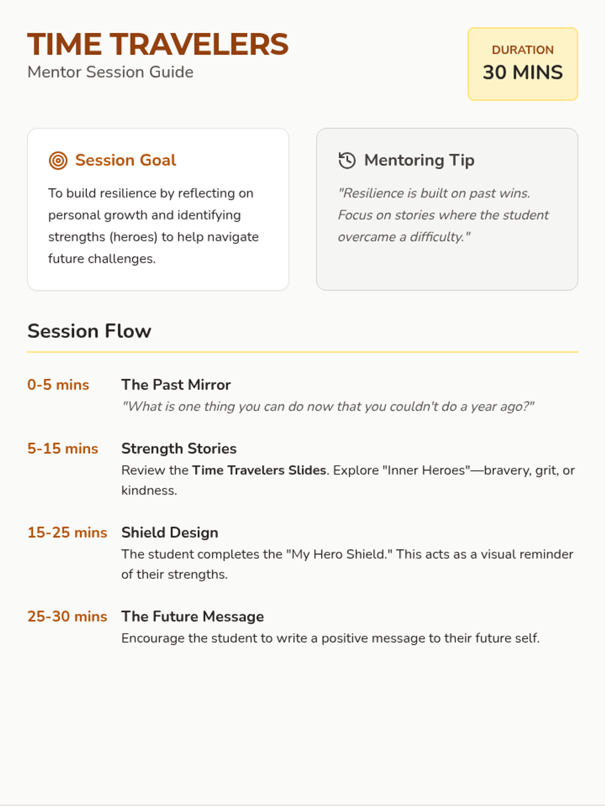 A mentor guide and 'Hero Shield' worksheet for a mentoring session on resilience and personal growth. Students reflect on their 'inner heroes' (strengths) and build a visual shield of support to prepare for future challenges.