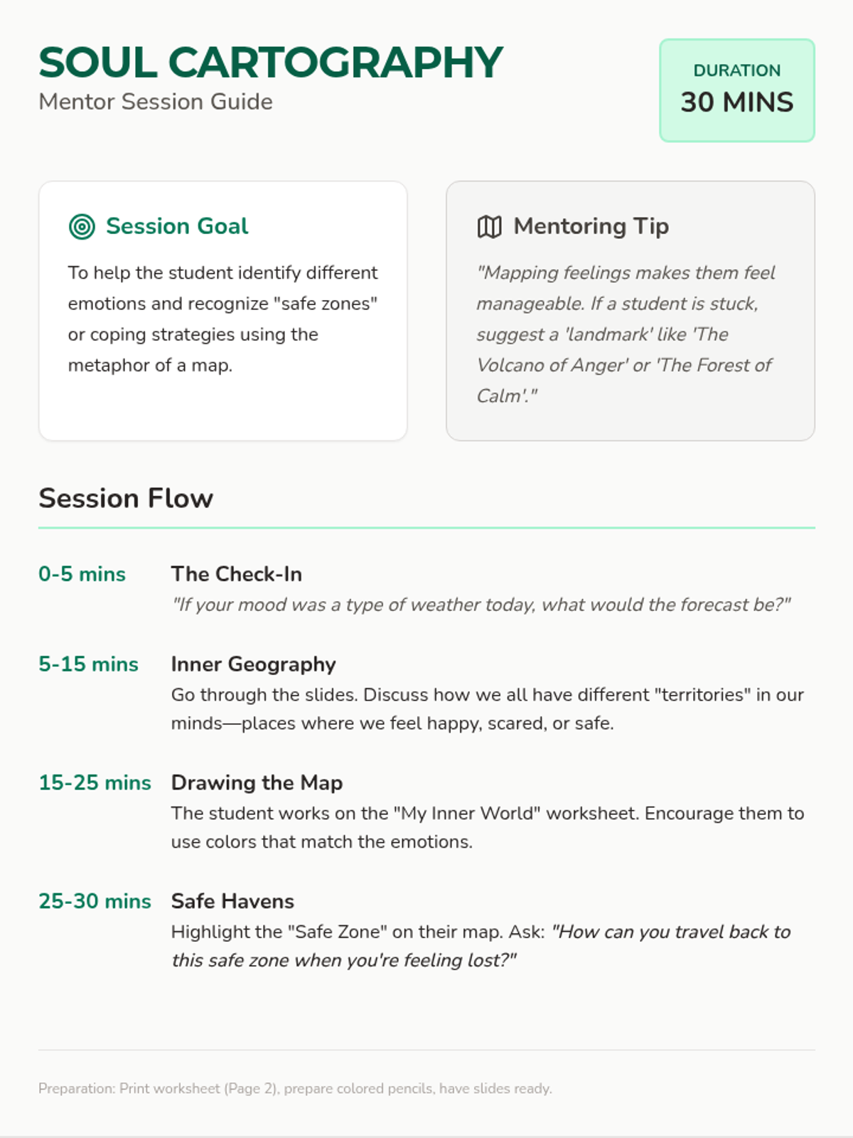 A mentor guide and student worksheet for a 30-minute mentoring session focused on identifying and mapping emotions through the lens of geography. Includes a structured session flow and a creative 'Inner World' mapping activity.