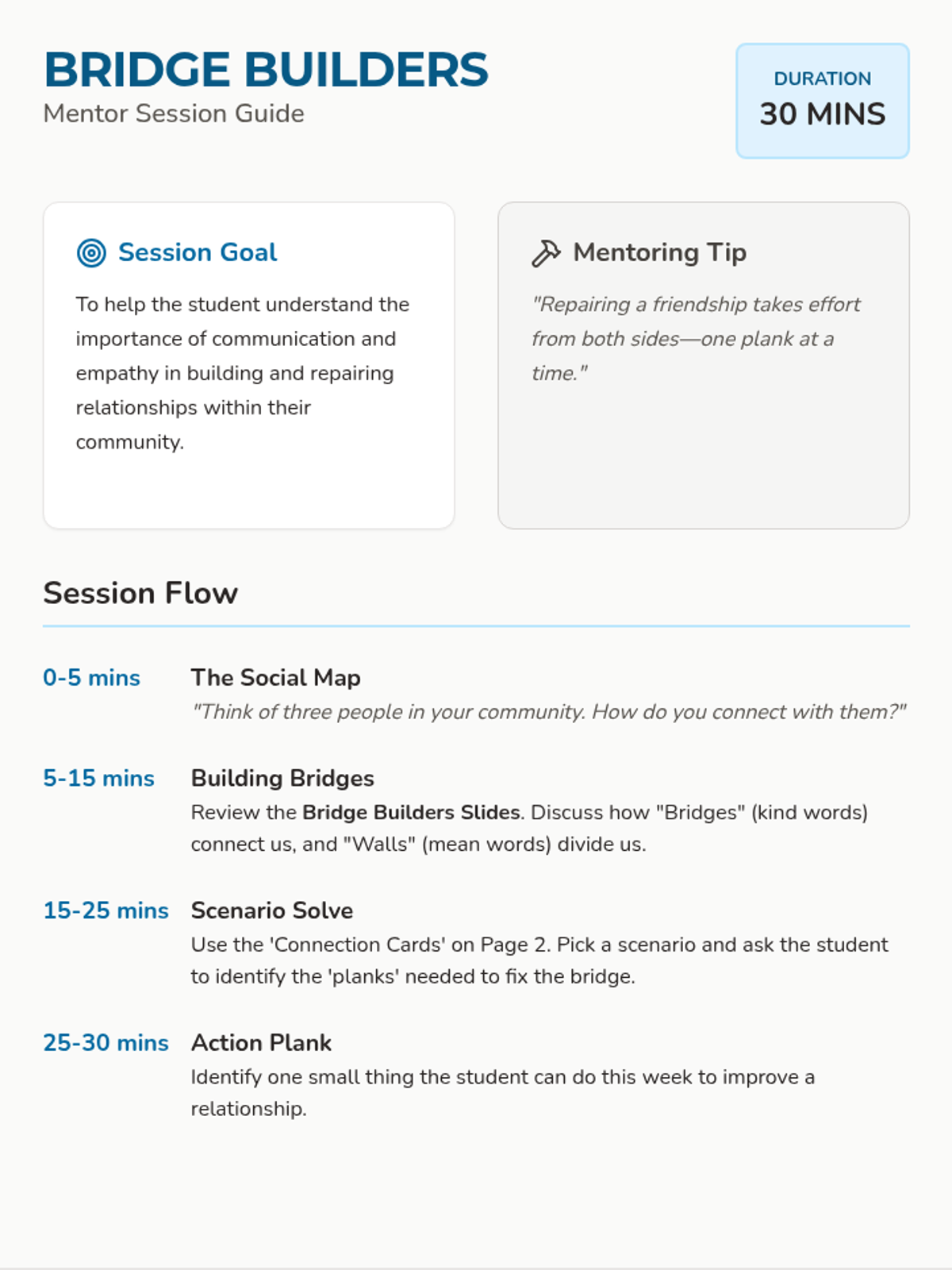 A mentor guide and activity card set focused on social skills and conflict resolution. Using the metaphor of 'Bridge Builders,' students explore how to repair misunderstandings and strengthen community connections.